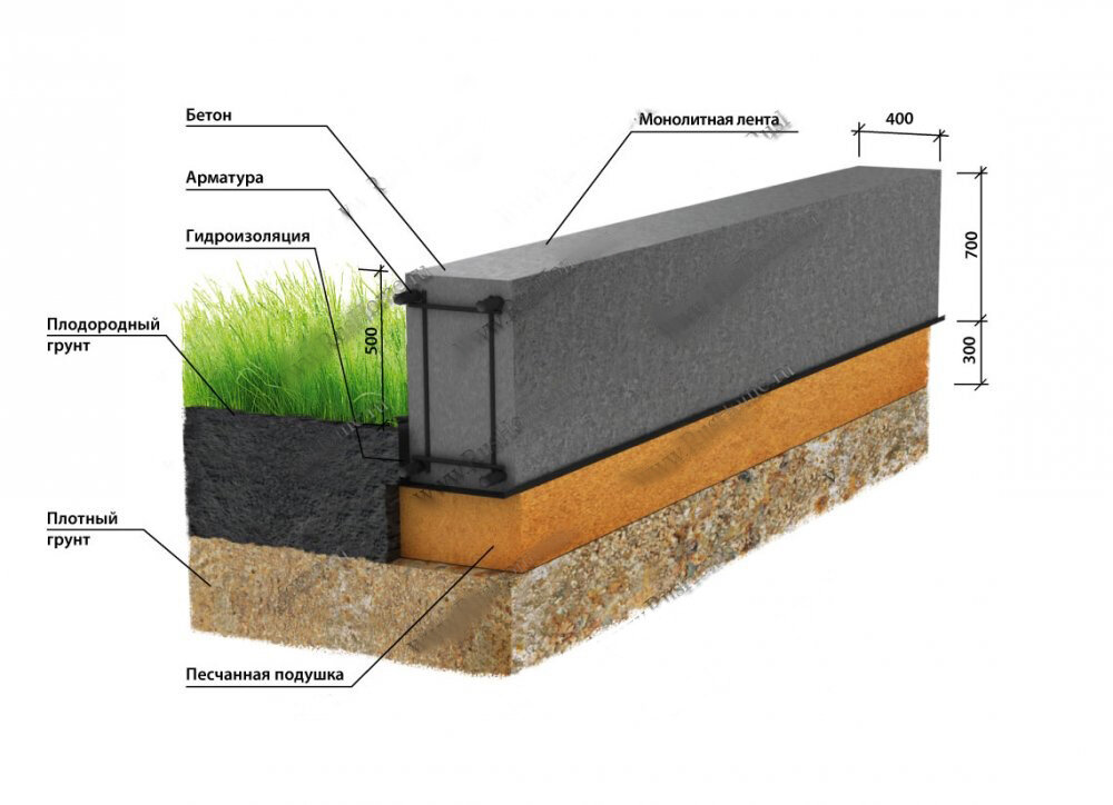 Типовой монолитный ленточный фундамент выполнен из бетона или железобетона с применением деревянной опалубки. К его плюсам можно отнести то, что при закладке не требуется применение автокрана. Лента фундамента может иметь переменную отметку по высоте, как по верхней, так и по нижней грани. Ленточный фундамент в монолитном варианте считается менее требовательным к рельефу и архитектурно-планировочным решениям вертикальных конструкций. Минусы такие же, как у типового ленточного фундамента: «лента» фундамента в плане точно повторяет план вертикальных несущих конструкций.