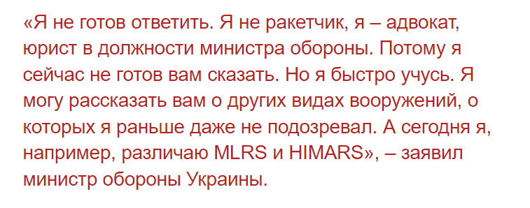 Недавно министр обороны независимой Алексей Резников сообщил, что он не разбирается в оружии. Прямо так и сказал. Главное, что быстро учится. Согласно Википедии, он увлекается подводным плаванием, лыжным спортом и парашютами, автогонками, для жены даже танго научился танцевать, а вот с оружием - не очень. Министр обороны, как мне кажется, должен в этом разбираться. Но даже если он заявляет, что он адвокат и юрист, то в этих отраслях хотя бы должен быть компетентен. В моем понимании адвокат и юрист должны так формулировать свои мысли, чтобы, как минимум, все их понимали, а как максимум - показывать свой профессионализм. А то он теперь оправдывается за свое недавнее заявление насчет миллионной армии и деоккупации юга. Не то он имел в виду, оказывается, это его английский не так поняли. И, наверное, не так его все понимали когда он говорил, что Донбасс - это раковая опухоль. А что делают с раковой опухолью?... Еще одна говорящая голова у власти, которая должна красиво болтать, чтобы выпр