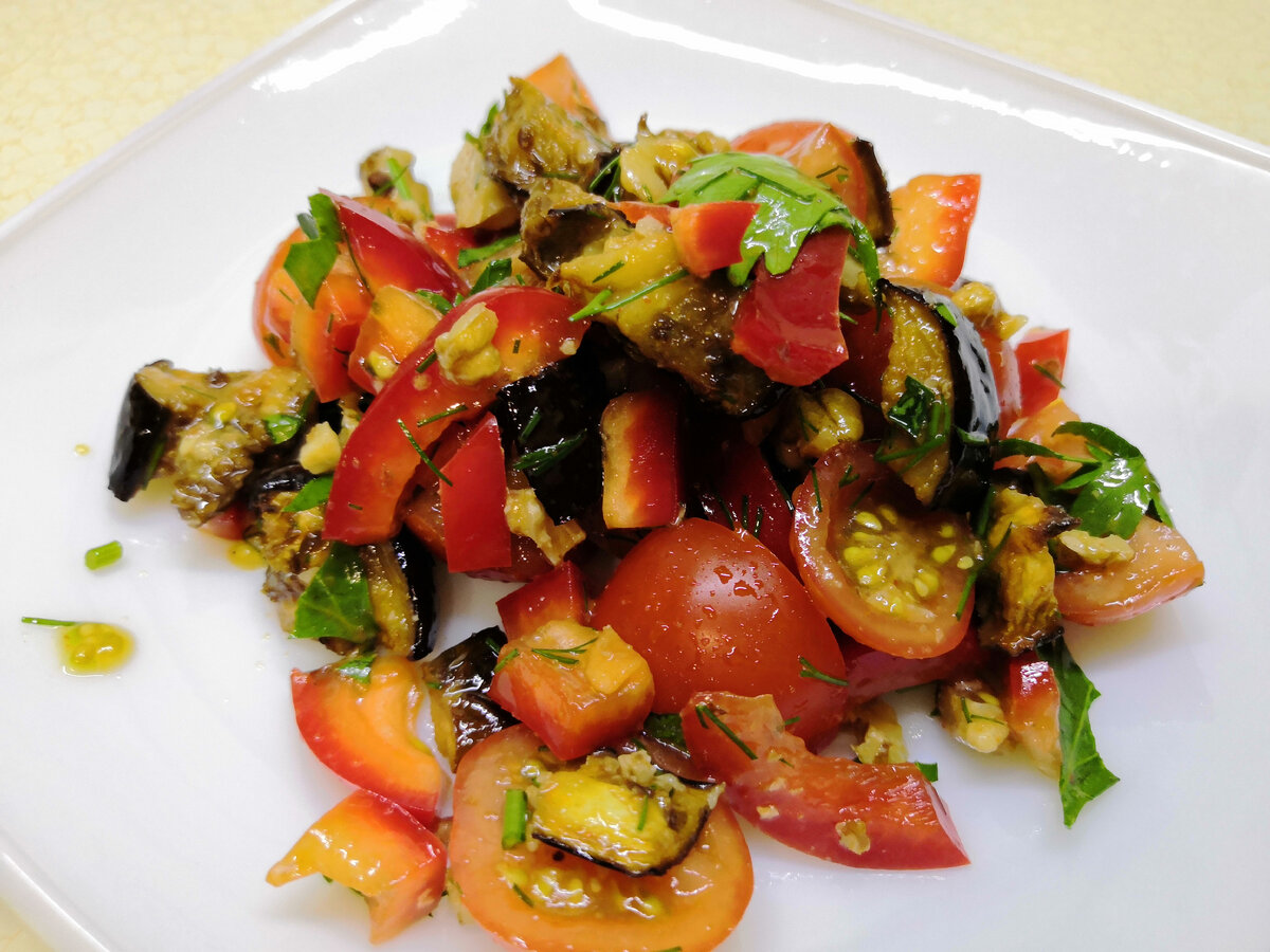 Нарезать помидоры, болгарский перец, зелень - у меня укроп и петрушка, измельчить чеснок и грецкие орехи. Чеснок я добавила сухой. Перемешать. Добавить запечённый баклажан, 1 ст ложку соевого соуса и 1 ст ложку растительного масла. Аккуратно перемешать. Если нужно - посолите. Мне соли хватило. Приятного аппетита!
