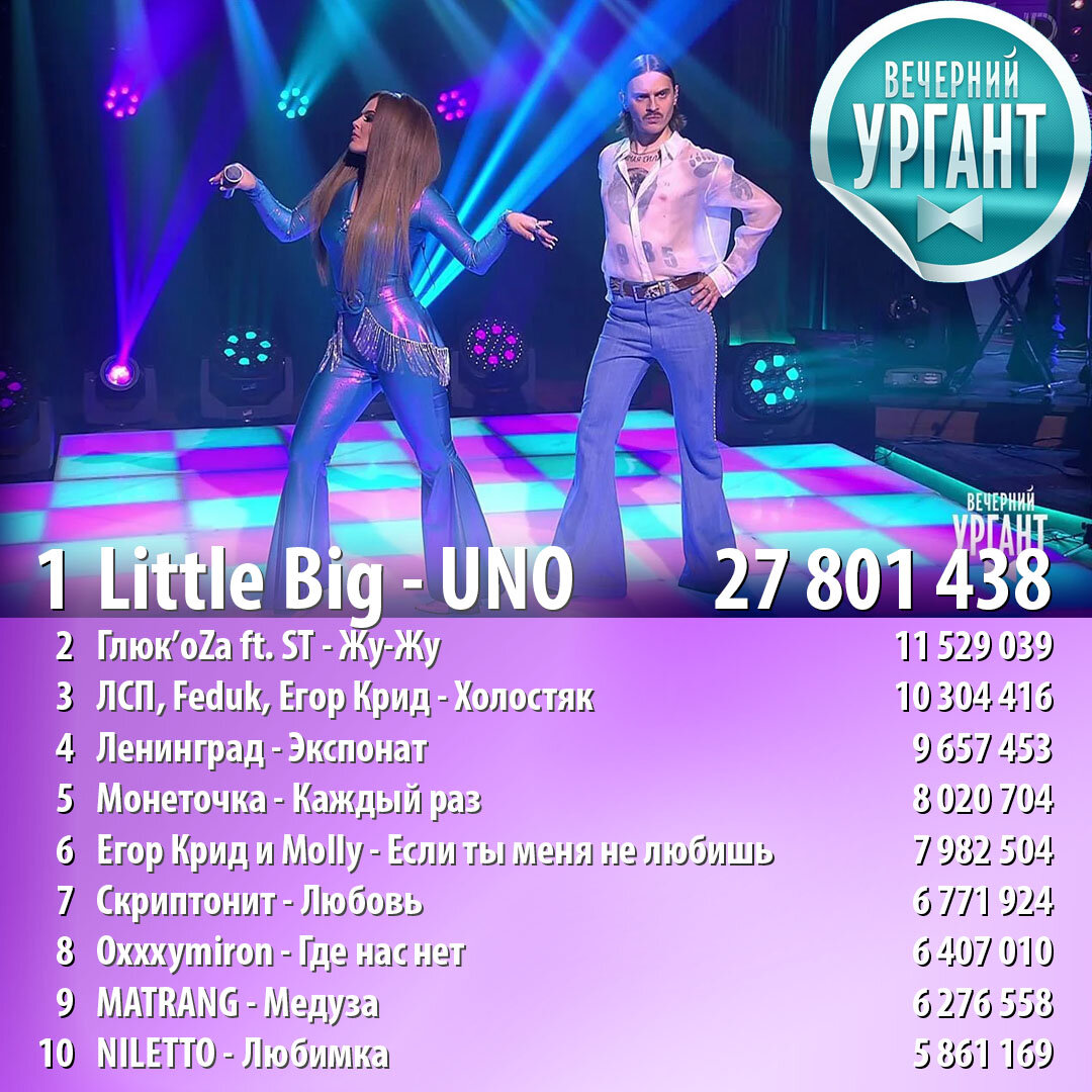 ТОП-100 ВЫСТУПЛЕНИЙ НА ВЕЧЕРНЕМ УРГАНТЕ ПО ПРОСМОТРАМ Данный топ я сделал 25 ноября, сейчас же канал Вечернего Урганта на YouTube удалён из-за санкций, а возможно передача и вовсе больше не будет выходить ☹ Так что топ получился роковым 11-100 места: 11. Rauf & Faik x NILETTO - Если тебе будет грустно (5 720 472) 12. Баста и Полина Гагарина — Голос (5 213 760) 13. Quest Pistols Show и Open Kids — Круче всех (5 130 393) 14. Little Big & Фрукты – Faradenza (4 996 322) 15. ПОШЛАЯ МОЛЛИ – Буду твоим песиком (4 820 072) 16. Элджей – Минимал (4 818 787) 17. Тимати и Егор Крид — Где ты, где я (4 724 632) 18. Billie Eilish - Bad guy (4 392 952) 19. АИГЕЛ — Татарин (4 203 769) 20. Луна — Jukebox (4 171 638) 21. RSAC x ELLA - NBA (Не мешай) (4 034 772) 22. Гречка – Люби меня люби (3 986 690) 23. The Hatters — Да, со мной не просто (3 931 560) 24. MARUV & Boosin – Drunk Groove (3 866 913) 25. Дора - Дорадура (3 742 430) 26. Егор Крид - Миллион алых роз (3 736 005) 27. Тимати, Джиган, Даня Милохин