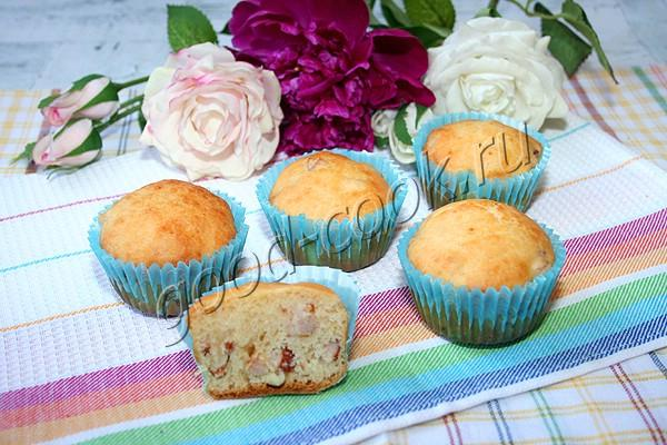 Вкус и аромат кексов будет зависеть от курицы - если взять варёно-копчёную, то кексы будут более спокойного вкуса. Но если использовать сырокопчёное куриное филе, то вкус у кексов будет изумительным. Сырокопчёная курица придаёт кексам преаппетитнейший аромат. А солоноватые кусочки курицы оттеняют вкус теста.
