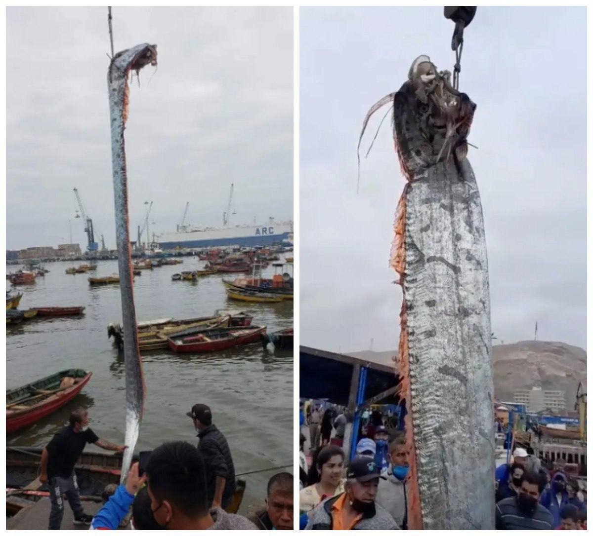 Это пятиметровое существо называется Сельдяной король. Обычно они живут глубоко под водой и появляются на поверхности из-за движений тектонических плит или болезней. Ну а рыбака, который выудит чудище, по традиции считают проклятым. Спасибо, 2022, только Сельдяного короля нам не хватало.
