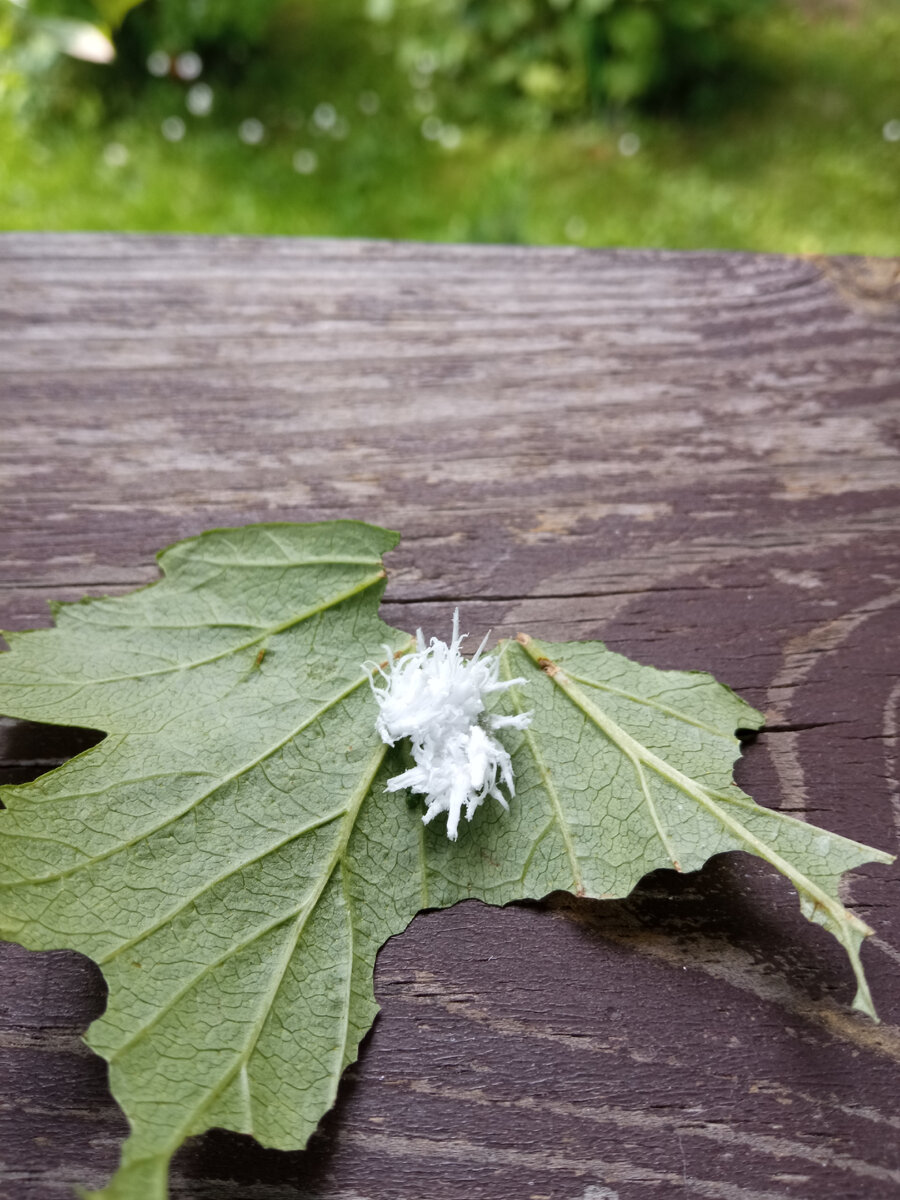 Порылась в интернете, ничего похожего не нашла. Гусеница уж очень странная. Может быть, она больная? А хлопья - это какая-нибудь плесень проросла?