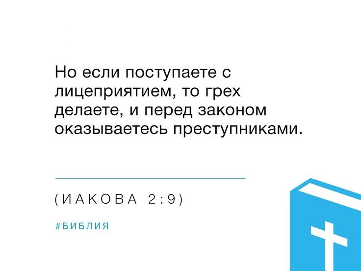 «Послушайте, братья мои возлюбленные, не бедных ли мира избрал Бог быть богатыми верой и наследниками Царства, которое Он обещал любящим Его? А вы презрели бедного. Не богатые ли притесняют вас, и не они ли влекут вас в суды? Не они ли бесславят доброе имя, которым вы называетесь? Если вы исполняете закон царский по Писанию: “Возлюби ближнего твоего, как самого себя”, — хорошо делаете. Но если поступаете с лицеприятием, то грех делаете и перед законом оказываетесь преступниками. Кто соблюдает весь закон и согрешит в одном чём-нибудь, тот становится виновным во всём. Ибо Тот же, Кто сказал “не прелюбодействуй”, сказал и “не убей”; поэтому если ты не прелюбодействуешь, но убьёшь, то ты также преступник закона. Так говорите и так поступайте, как имеющие быть судимы по закону свободы. Ибо суд без милости не оказавшему милости; милость торжествует над судом» (Иак. 2:5-13).
