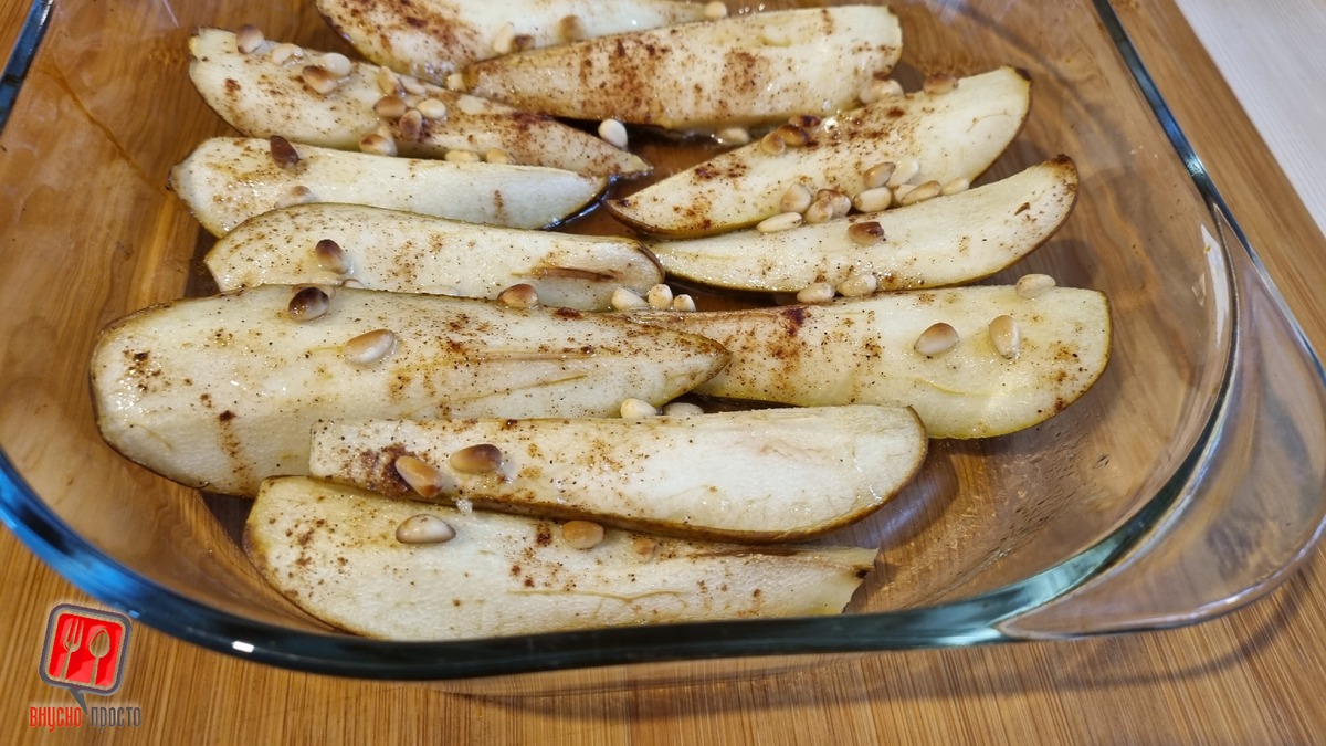 Приветствую дорогой соискатель вкусного из простого. Делюсь с Вами этим удивительным рецептом. Ингредиенты: Груша – 3шт. Мед – 1 ст.л. Кедровые орешки – 30гр. Корица – ¼ ч.л. Способ приготовления: Вымыть груши и порезать на 4 части, удалить середину. Выложить в форму для запекания. Полить на груши мед, осыпать корицей, добавить сверху кедровые орешки. Поставить в духовку C=180 градусов, T= 20 мин. Приятного аппетита! Получается очень вкусно. Пожалуйста напишите в комментариях, пробовали вы такой рецепт.