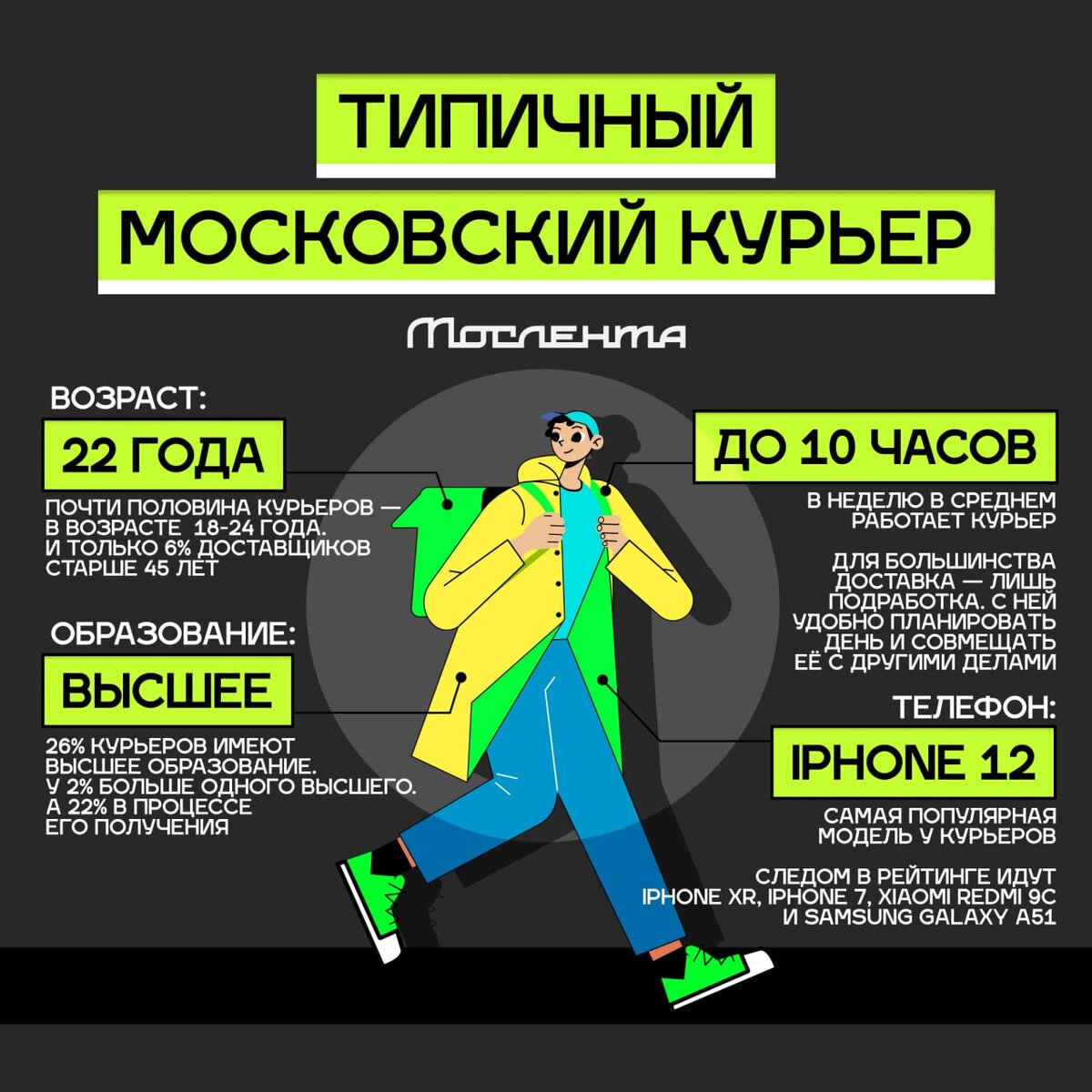 Напомню, что почти уже три года работаю в сфере доставки еды и продуктов. В основном - пешим и велокурьером + небольшой опыт работы сборщиком заказов в гипермаркете. Недавно мне показали вот такую "забавную" инфографику - типичный московский курьер! Ему всего-то 22 года, но он уже с высшим образованием - это ещё ладно. Он работает меньше 10 часов в неделю - хм, конечно, есть и такие, но чтобы это было прямо типично? И совсем уж удивительно, что самый популярный телефон "типичного курьера" - iPhone 12! Во-первых, в большинстве сервисов - Яндекс-Еда, Delivery Club, Самокат - рабочее приложение существует только под "андроид", работать с айфоном попросту нет возможности. Во-вторых, даже если у этого "типичного курьера" два смартфона и айфон лежит в кармане "про запас" - какое это имеет отношение к его работе курьером? Откуда вообще взялся этот "портрет"? В общем, это опубликованный изданием "Мослента" результат опроса, который провёл сервис "Достависта". Бог его знает, каким методом они