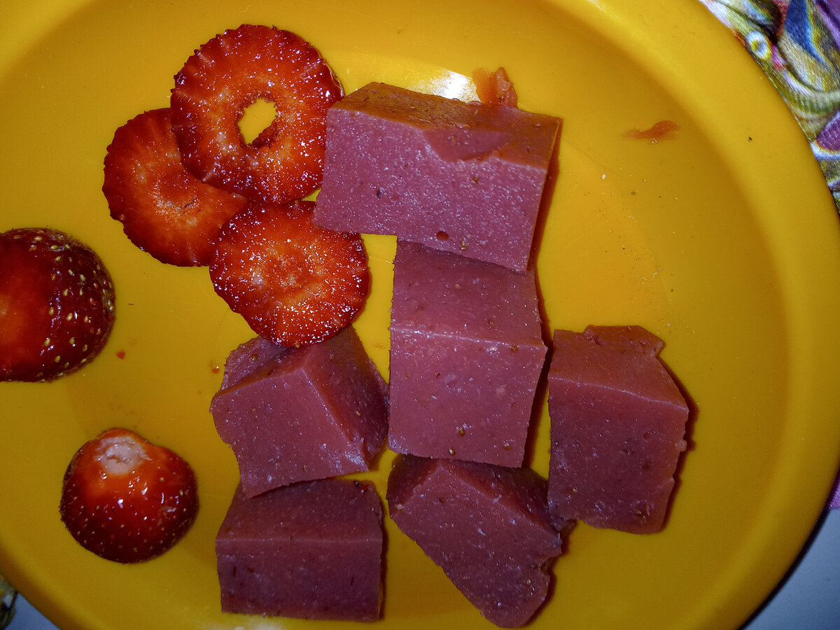 Делать этот десерт недолго, около десяти минут, ем я его по какой-то причине гораздо быстрее, поэтому прошу дочь ежедневно повторять! Рецепт собственный по мотивам восточных сладостей. Нам нужна микроволновка, чашка мытой садовой крупноплодной земляники (клубника, виктория), один банан, три столовых ложки сахара, три столовых ложки КУКУРУЗНОГО крахмала с небольшой горкой. Измельчаем в блендере землянику и банан. Земляники насыпаем столько, чтобы в итоге у нас получилось 3 стакана массы. Массу выливаем в емкость для микроволновки, добавляем сахар и сухой кукурузный крахмал, перемешиваем. В микроволновке на самом слабом нагреве "крутим" наш десерт 1-2 минуты, вынимаем и перемешиваем. И так делаем 3-4 раза пока масса не станет густой и прозрачной. Ставим остывать и после загустения можно есть. Очень вкусно! Примечания: 1) можно делать по принципу приготовления киселя, тогда немного сырой массы из земляники и банана отливаем и разводим в ней крахмал, оставшуюся доводим до кипения и вл