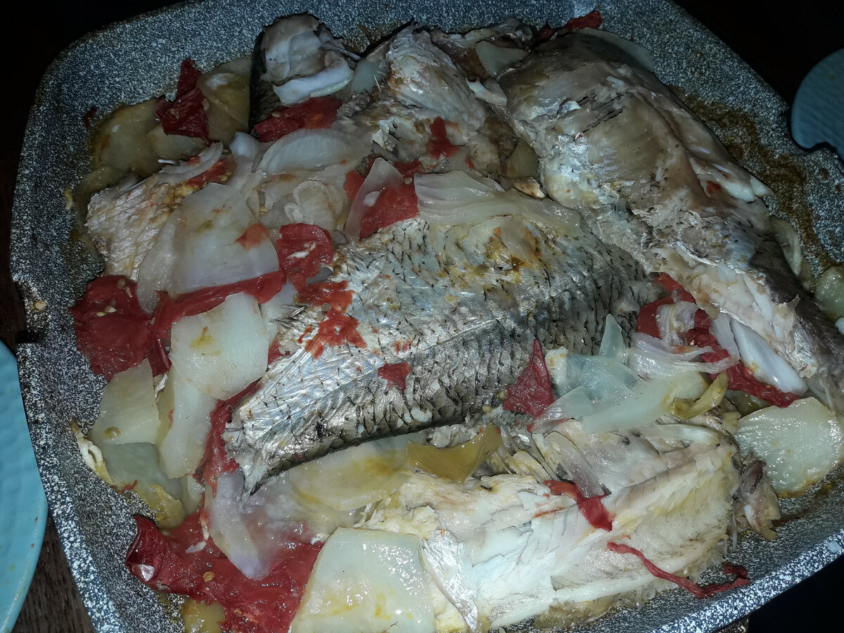 Привет, друзья! Я рассказываю иногда о своём "Проекте Ы" Вчера в нашем местном чате продавали рыбу, я купила 3 кг подлещиков. Стала чистить из на улице, что бы дом не запачкать чешуей. А потом и готовила рыбу на улице. Почему на улице? Потому что в доме все вверх ногами было, мне кухню устанавливали. Да и пыльно. А кроме того рыбный запах и брызги были бы. Поставила на улице тубаретку, на нее плитку, на плитку сковородку большую. Сначала смазала ее маслом. Потом положила туда очищенную рыбу, овощи ( болгарский перец, 2 помидора, 2 лукрвицы и 2 картошины).посолила и тушила часа 2. Не мешала ни разу. Пожалела что фольги нет. Так бы накрыла сверху и тушилось бы лучше- у этой сковороды нет крышки, а она большая и квадратная. Пришлось сверху пару тарелок положить, что бы сок от рыбы и овощей не испарялся. Пока тушила мастер собрал кухню почти всю. Ручки и столешницу потом приделает. Ручки я купила которые мне не нравится как сммотрятся и маленькие очень. Потому я из обратно сдам в магази