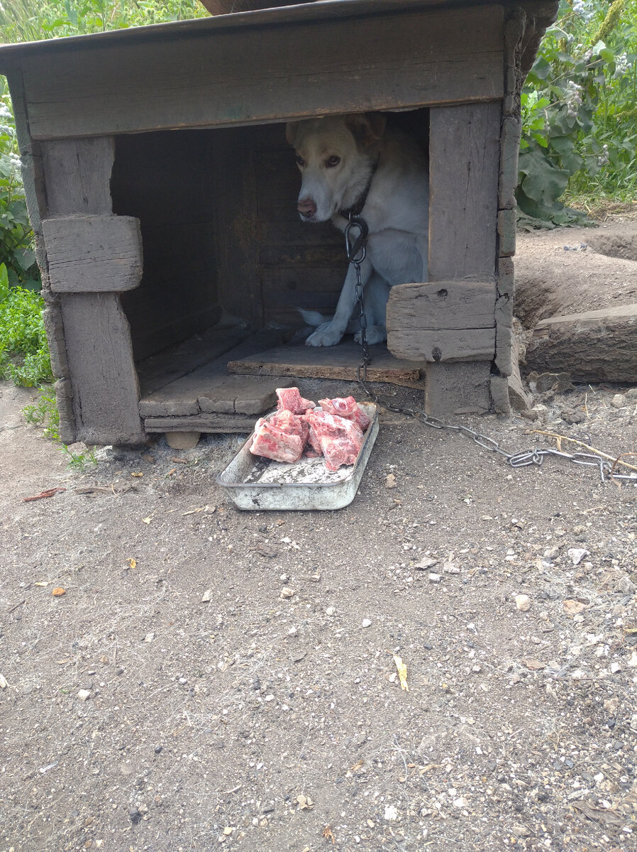 Они домашние животные и у них есть семья, большая, 8 человек! Но вот случилось горе в семье – стали хозяева погорельцами в начале мая, слава богу, что без потерь. Администрация города помогла им временным жильём, люди – продуктами, вещами, а мы, в свою очередь, не оставили их 2 собак одних. Кормили в начале по очереди я и подруга Оля, потом я не стала успевать по времени. Оля практически одна ездит и кормит, я со своей стороны помогаю ей продуктами для кормления этих животных. Собаки очень долгое время находились одни – понятно же, у хозяев горе... Нашли мы хозяев, поговорили, вроде сказали, что кормить будут сами, и не обманули! Мы свозили на рентген одного из псов, на лапу не вставал: травма старая, сросшаяся, получена от свободного выгула. Сейчас стали реже мы приезжать, продуктов нам не хватает, да и хозяева отзваниваются, что сходили, чтобы не получилось, что в один день густо, а в другой пусто... В один из дней после кормления собак приехали мы повторно: не с проверкой, а стоя