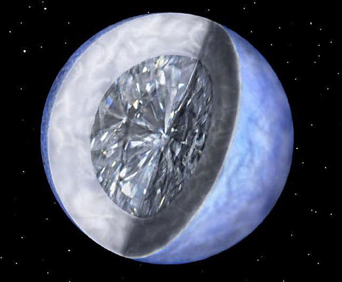 Планета из графита и алмазов Ещё одну таинственную планету астрономы обнаружили в созвездии Рака. По мнению сотрудников Йельского университета, она вдвое больше и в восемь раз тяжелее Земли. Но главное -Янсен почти целиком состоит из графита и алмазов, причём на долю последних приходится треть его вещества Forbes оценил стоимость планеты в $26.9нониллионов. По космическим меркам, гиганский алмаз расположен неподалеку от землян -всего в 40 световых лет. Правда, температура его поверхности составляет 2.148 тыс. градусов. Скорость вращения на столько высокая что один год там равняется 18 земным часам. Кроме того, недавно учёные выяснили, что одна сторона Янсена находиться в расплавленном состоянии и представляет собой углеродную лаву. А скорость вращения на столько высокая что один год там равняется 18 земным часам.