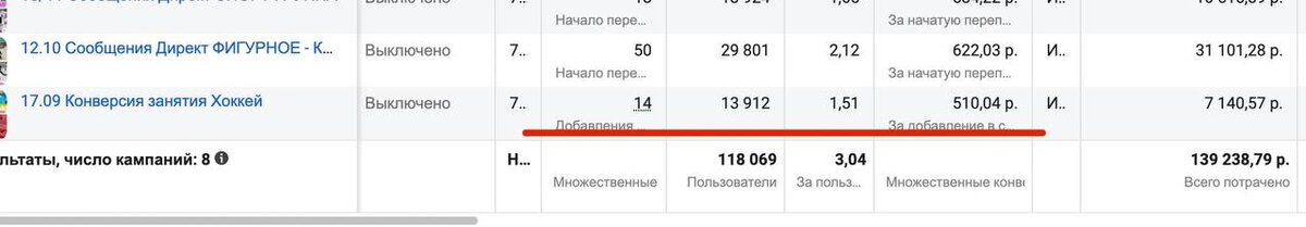 - тестировали еще кампанию на набор спортивной группы, но стоимость заявки нас не устроила, поэтому рекламная кампания была отключена