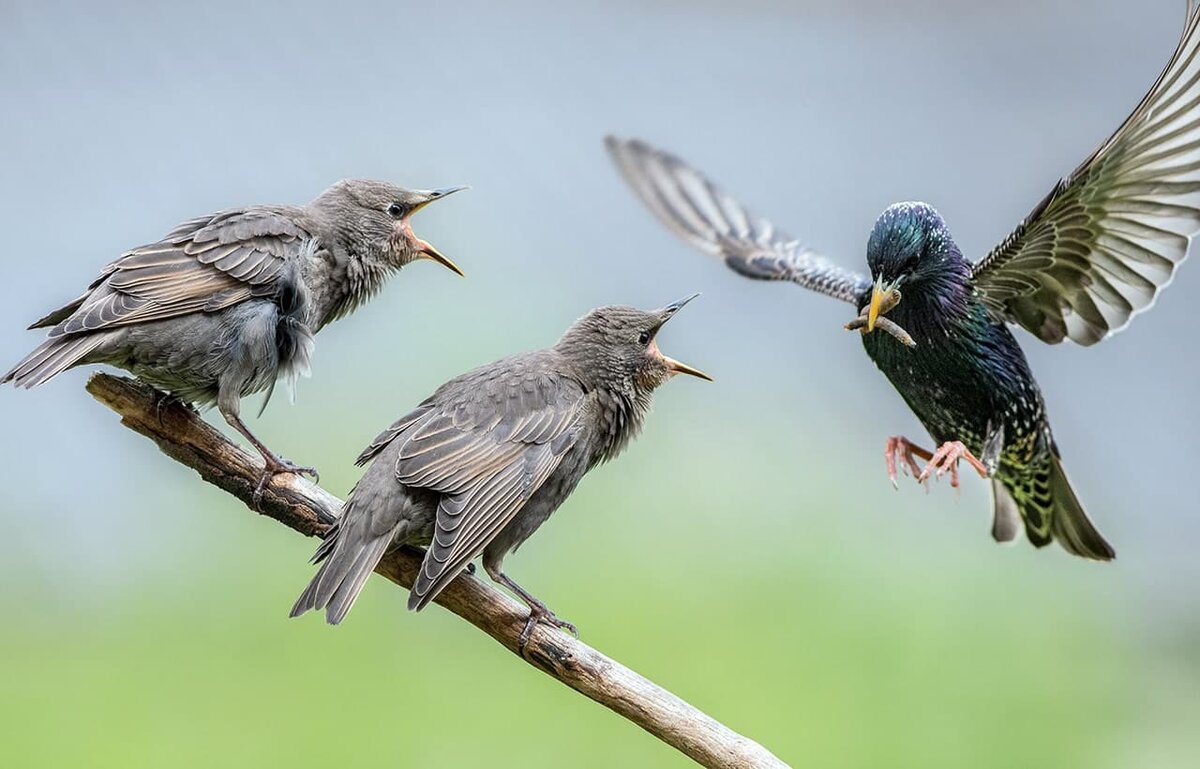 Скворец (лат. Sturnus Vulgaris) – перелетная птица, широко распространенная на многих континентах. Вес скворца редко превышает 75 граммов, а длина туловища составляет 20-25 сантиметров. Тело птицы массивное, с крупной головой и короткой шеей, лапы сильные, увенчанные острыми когтями. Клюв птицы длинный и тонкий, немного изогнутый вниз. Оперение взрослой особи обыкновенного скворца – черное, с характерным металлическим отблеском. Над крыльями и на голове могут присутствовать белые пятна, область горла и головы отливают фиолетовым оттенком, брюшко – синим, спина – зеленоватым. Весной первыми прилетают самцы, занимая дупла деревьев, пустоты за обшивкой дома или окна, скворечники, выселяя из них воробьев. Для подстилки птицы тащат все, что могут раздобыть во дворе, в лесу или на лугу. Самочка откладывает 5-6 голубых яиц длиной 30 мм. Это немного, но зато родители успевают вывести птенцов дважды за лето. Дно гнезда скворцы вымащивают мягкими стебельками трав, перьями, листьями, мхом. Кормя