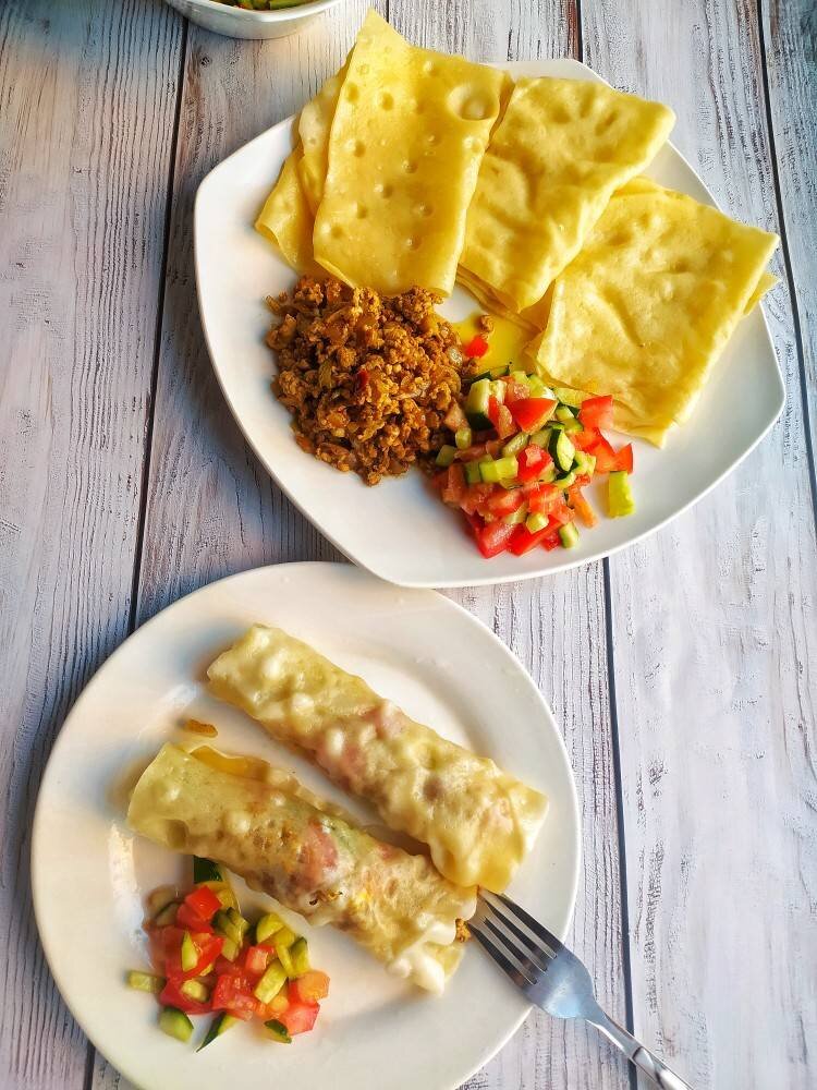 Все выкладываем на тарелку. Берём тесто добавляем фарш, салат и сворачиваем. Они получаются очень сочными и вкусными. Попробуйте!