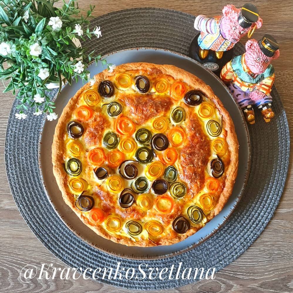 #вкусно #понедельник Этот пирог украсит любой стол и порадует вас своим вкусом. В этом пироге самое главное – разноцветные овощи: зеленый и желтый цукини, баклажан и морковь. Желательно, чтобы овощи были приблизительно одного диаметра - тогда будущие "розочки" не будут отличаться по высоте. Морковь лучше предварительно поместить в микроволновку для более лёгкого нарезания на 1-1,5 минуту. За вдохновение спасибо @cook_10228582 Ингредиенты: Для теста:, яйцо, сметана, мука, разрыхлитель, Для начинки:, твердый сыр, творог, яйца, соль, итальянские травы (или прованские), цукини (зеленый + желтый), баклажан, морковь Способ приготовления: Смешиваем все ингредиенты для теста. Тесто получается мягким. Для начинки натираем сыр, смешиваем с творогом, яйцами, солью и специями. В форме для выпечки из теста формируем корж с бортиками. Выливаем начинку. Нарезаем овощи вдоль длинными тонкими пластинками. Скручиваем из них '"розочки" и ставим в пирог. Делаем это произвольно. Cмазываем "цветочки" оливко