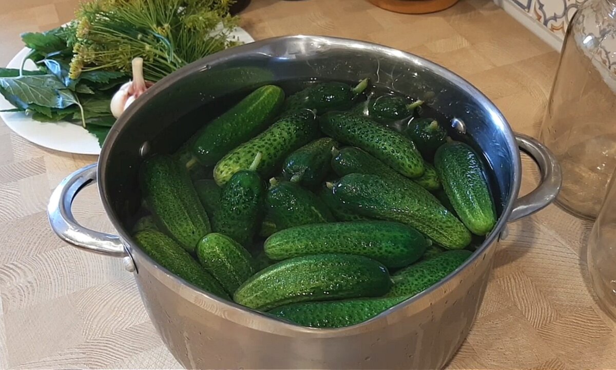 Маринованные огурцы заготавливаю на зиму только так. Рецепт действительно очень хороший. Огурчики получаются плотные, хрустящие, чуть-чуть сладковатые. Очень вкусные! Отлично хранятся даже при комнатной температуре. КАК ПРИГОТОВИТЬ: Огурчики беру небольшие, 8-9 см. Предварительно замачиваю в холодной воде, на 2-3-4 часа, смотря на сколько давно они были собраны. Промываю все веточки и листочки, которые положу вместе с огурцами. Банки не стерилизую, просто мою содой. На дно каждой банки кладу зонтики укропа, смородиновые листочки, листья хрена и вишни, зубчики чеснока, черный перец горошек. А еще добавляю любисток (травянистый многолетник - растет на даче), с ним маринованные огурчики получаются особенно вкусно-пряными. У огурцов отрезаю хвостики и плотно закладываю в банки. Сверху кладу еще листочки по желанию. Кипячу воду: Два раза заливаю огурцы просто кипятком, а третий раз маринадом. Первый раз залила огурцы кипятком - оставила постоять под крышками 10-15 минут. Слила воду обрат
