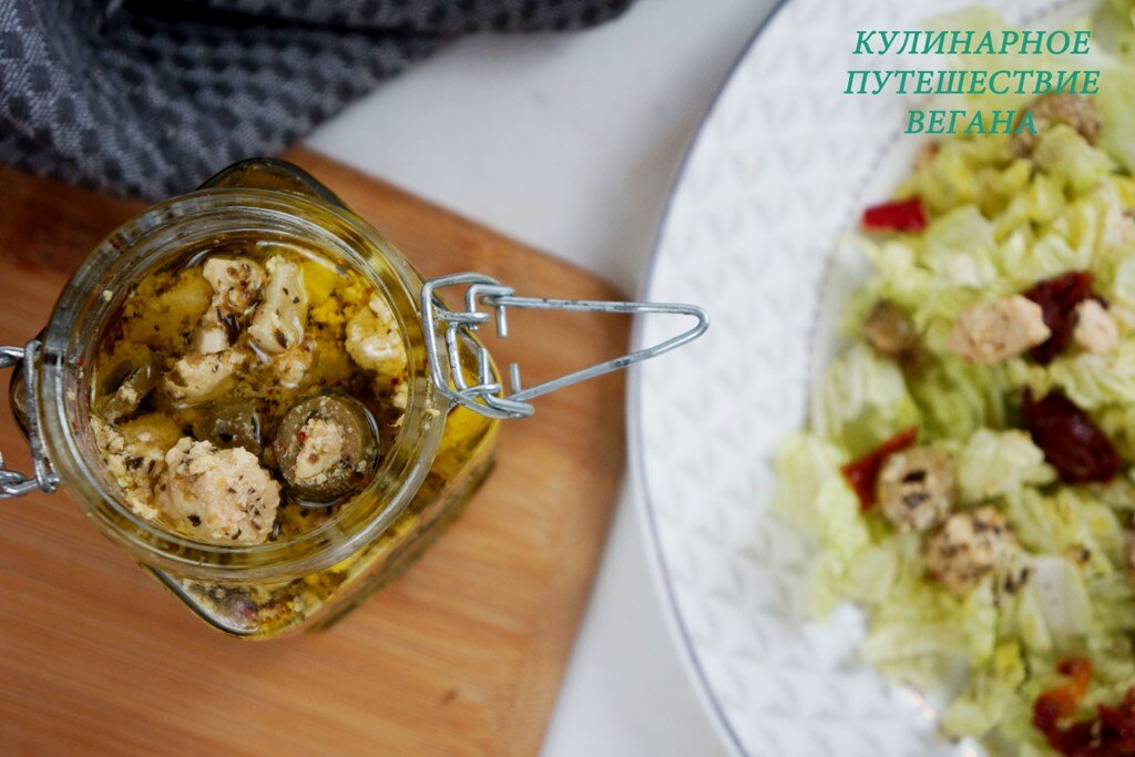 Друзья, помните какой время назад я вам рассказывала о домашней фете из тофу с травами? Так вот, хочу поделиться новой версией подобной закуски. Такую закуску я готовлю на основе ферментированного тофу (я ферментирую тофу сама и ниже расскажу как это сделать – это очень просто). На мой взгляд, так получается вкуснее, так как ферментированный тофу и обычный довольно сильно различаются. Ну и, конечно, пробиотики никто не отменял. Но если вы ограничены во времени, то можно попробовать использовать просто обычный тофу. Я использую совсем другие специи и немного другую технологию приготовления, чем в рецепте с фетой (можно сказать я ее немного усовершенствовала!)). Закусочка получается гораздо острее и, конечно, оливки добавляю свою пикантность. Еще к этой закусочке отлично подойдут сушенные в масле помидорки – если они у вас есть, то смело добавляйте. А как ее использовать? Мой любимый вариант – добавлять в салат при приготовлении. Получается, что вы не только увеличиваете количество белк