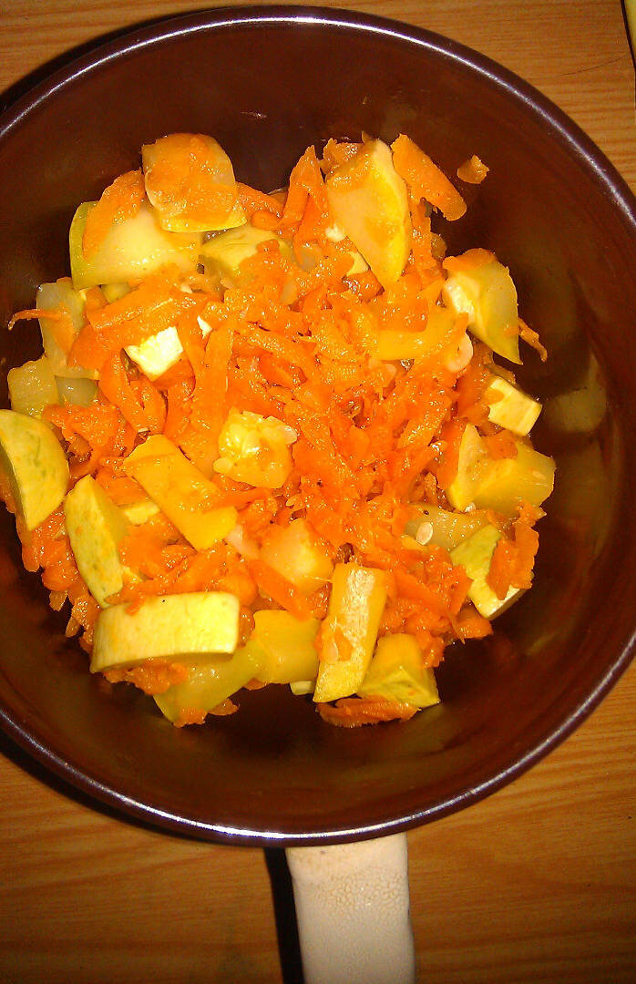 Кабачок и морковка - доступны и полезны. А вкусными их сделают правильно подобранные приправы. #меню #вкусно Ингредиенты: вода, горошины перец чёрный, кориандр сушёный измельчённый, кабачок, морковь, соль, сахар, чеснок, кетчуп, лимон Способ приготовления: Морковь натереть на крупной тёрке или тоненько нарезать. Кабачок нарезать кусочками покрупнее моркови, примерно в 1 см. В кастрюлю налить чуть-чуть воды (чтобы только дно смочить), сложить туда же овощи, добавить соль и сахар. Накрыть крышкой, томить минут 5 с момента закипания, до готовности. Овощи выделят сок, поэтому блюдо не подгорит. За это время нарезать лимон и чеснок. Добавить лимон, чеснок и кетчуп в кастрюлю с овощами, перемешать и потомить ещё пару минут. Дать настояться под крышкой ещё несколько минут. Подать можно со сметаной. На фото показано приготовление из половины указанных ингредиентов, т.е. на 1 порцию.