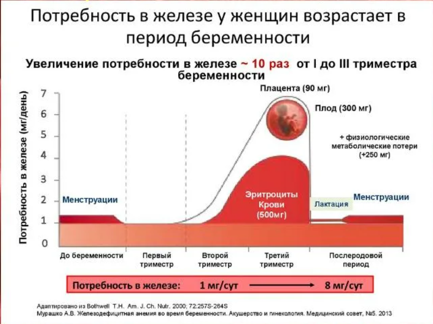 Железо при беременности и родах расходуется на рост эритроцитов матери, рост плода и плаценты, родовую кровопотерю. Потребность в железе удваивается во II триместре и утраивается в III триместре. Как правило, покрыть ее при помощи питания трудно. Исходя из потребностей плода важнее всего избежать железодефицита в третьем триместре и к моменту родов, что достигается своевременным профилактическим приемом препаратов железа.
