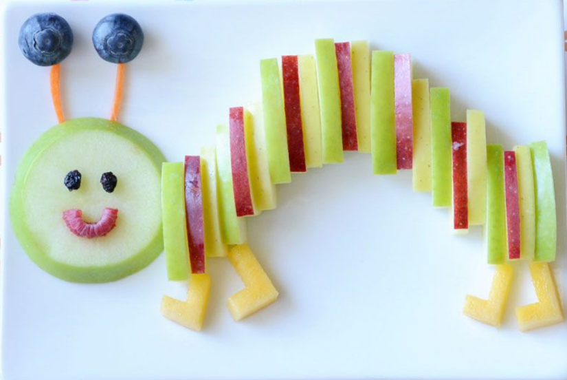 Сегодня предлагаю приготовить с детьми веселую и полезную для здоровья еду. Деткам она обязательно понравится. Если каких-то ингредиентов не хватает, включаем фантазию: всегда их можно заменить чем-то другим, ну кроме яблок, пожалуй. Яблоки здесь основа. Текст озвучен в конце статьи. Apple caterpillar - Гусеница из яблок We will need: - Нам потребуется: ● 1 red apple - 1 красное яблоко ● 1 green apple - 1 зеленое яблоко ● 1 yellow apple - 1 желтое яблоко ● 2 blueberries - 2 черники (голубики) ● 1 raspberry - 1 малина ● 2 black currants - 2 черные ягоды смородины ● 1 baby carrot - 1 маленькая морковка ● 1 slice of nectarine - 1 кусочек нектарина How to make it: - Как готовить: Take a knife. - Берём нож. Slice up your green apple and place 1 slice on a plate for the caterpillar’s head. - Нарезаем тонкими ломтиками зеленое яблоко и кладем 1 кусочек на тарелку. Это будет голова гусеницы. Slice (up) all three of your apples into small thin slices. - Нарезаем все 3 твоих яблока на маленьк