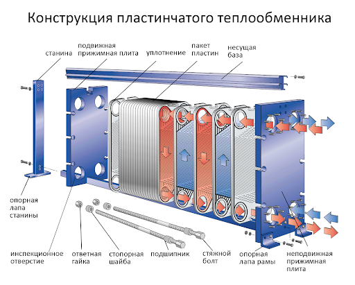 Сегодня на рынке представлены разные теплообменные модули, отличающиеся не только по предназначению и мощности, но и по конструктивным особенностям. У каждой разновидности приборов имеются свои особенности и отличительные преимущества. Есть и определенные конструктивные различия, требующие к себе особенно пристального внимания. Разберем устройство типового теплообменного контура на примере изготовленного по пластинчатой технологии блока. Обратите внимание. Особенность модулей такого типа заключается в возможности регулировки площади обмена энергией за счет добавления пластин с идентичными габаритами или их удаления. При этом устройство остается достаточно компактным и производительным одновременно. Конструкция теплообменника Типовой модуль конструктивно представлен двумя плитами. Речь идет о подвижной основе и неподвижном модуле. Каждая пластина оснащена входом для рабочей жидкости и имеет отверстие для ее отвода. Герметизация пространства между отдельными пластинами осуществляется з