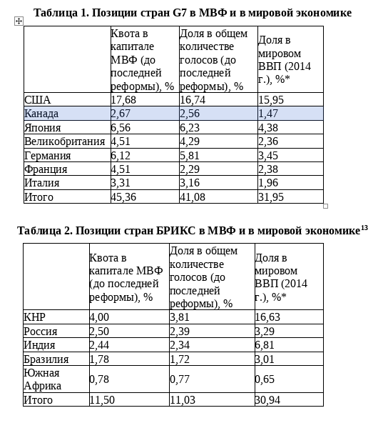 Нынешнее положение объясняется и тем, что самая большая квота в капитале МВФ - 17,68% и доля в общем количестве голосов - 16,74% принадлежит США, тогда как доля стран БРИКС в капитале Фонда составляла 11,50%, в общем количестве голосов – 11,03%, России принадлежит всего около 2% от общего количества голосов.