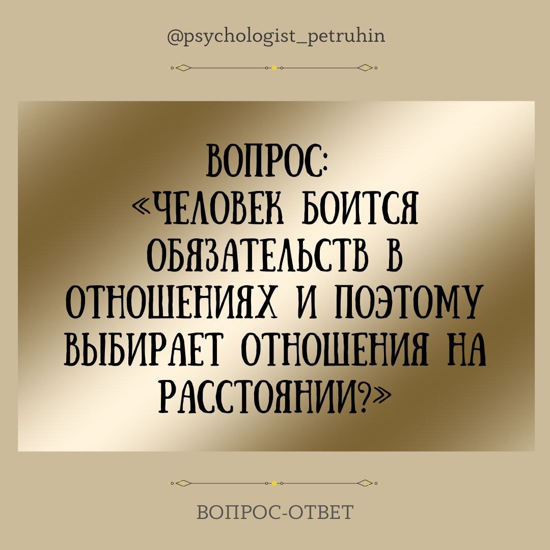 Вопрос: «Человек боится обязательств в отношениях и поэтому выбирает отношения на расстоянии?». Никто не боится обязательств, и любой человек даже сам с удовольствием их возьмёт, если отношения представляют ценность. Даже самые интровертируемые личности начинают действовать и создавать отношения, если они им подходят. Перестают обращать внимание на какие-то страхи и ограничения. И никто не будет брать никаких обязательств, и никак не заставишь человека это делать, когда отношения не имеют ценности. Обычно навязывает обязательства человек, который не представляет ценности для отношений. Ему нечем больше удерживать партнера, и он пытается навязывать себя силой, манипуляцией (возьми обязательства за отношения). Нет никаких обязательств в отношениях. Люди создают отношения по своему желанию: если они являются ценными, то люди их берегут и сохраняют. Обязательства появляться только в браке и только социальные и родительские. Если в отношениях образуются дистанция и расстояние, это говорит о