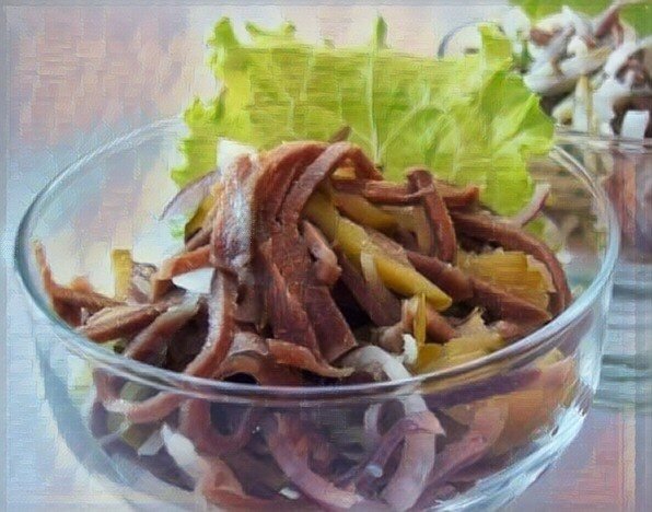 Главная мощь и сила этого салата - заправка! Теперь по порядку: Три ингридиента - отварная говядина - красный лук - соленый огурец На заправку - растительное масло - лавровый лист - черный перец - чеснок Самое главное в этом салате это заправка и время выдержки в холодильнике! Заправка: Льем масло на сковороду. Добавляем туда перец и лист лаврушки, и чеснок. Прогреваем до золотистости чеснока. И вот эту заправочку щаливаем через ситичко в смесь ингридиентов салата. А после даем ему настояться в холодильнике часов восемь! Наши выводы и вопросы по рецепту: -это правда вкусно! - обязательно дать долго настояться. - очень ароматная и интересная заправка. - а можно ли другое мясо, не говядину? - а маринованые огурцы вместо соленых, можно? По последним двум пунктам - нужно пробовать! Всем, приятного аппетита. #рассказ #рецепт #салат #кухня