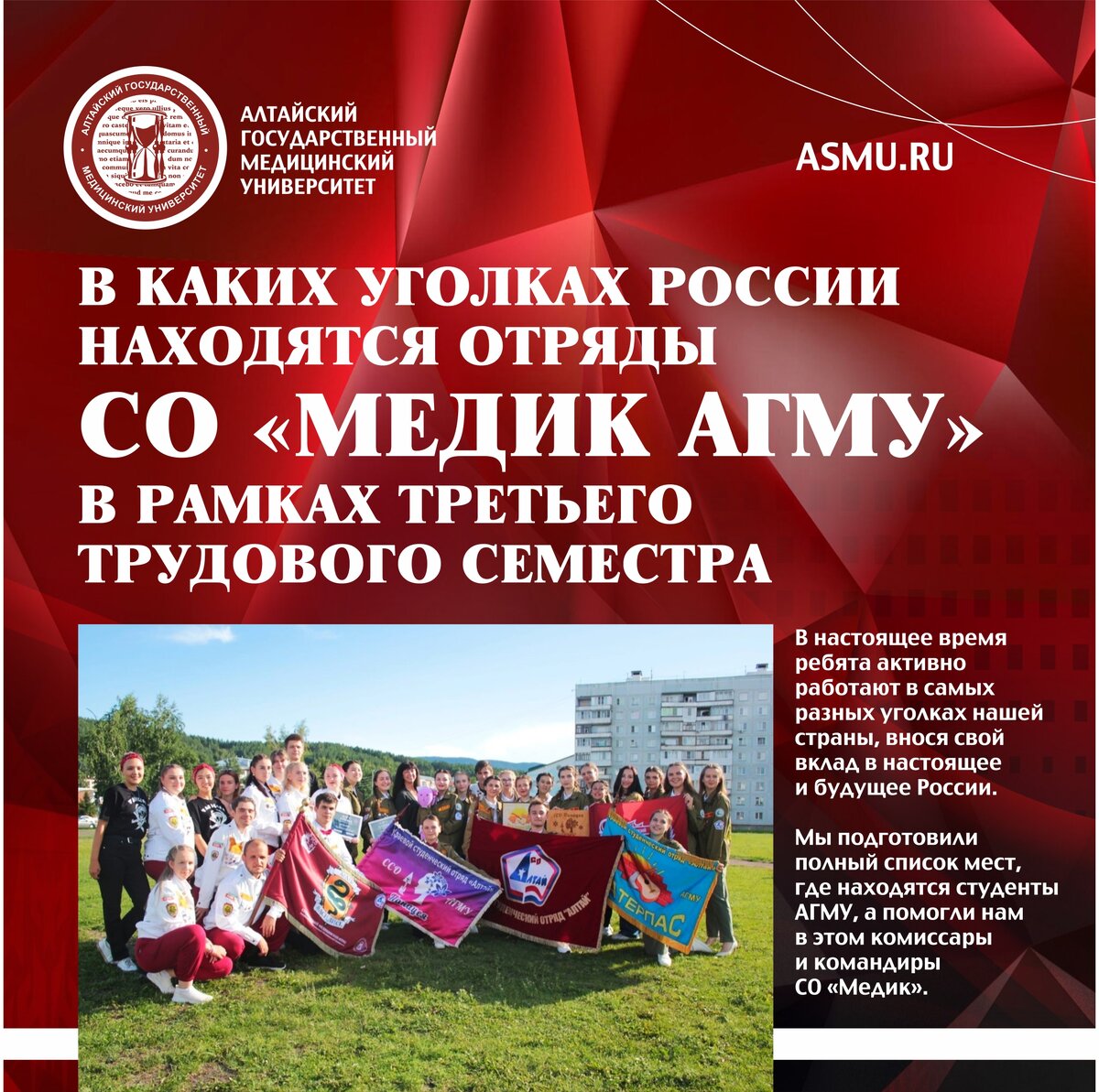 В каких уголках России находятся отряды СО "Медик АГМУ" в рамках третьего трудового семестра . Для студентов Алтайского государственного медицинского университета - бойцов СО "Медик" - в самом разгаре третий трудовой семестр. . В настоящее время ребята активно работают в самых разных уголках нашей страны, внося свой вклад в настоящее и будущее России. . Мы подготовили полный список мест, где находятся студенты АГМУ, а помогли нам в этом комиссары и командиры СО "Медик". . Строительные отряды в этом году покоряют международные и всероссийские объекты:⠀ . ССО «Сольвейг» – ВСС «Мирный Атом» г. Озерск; ⠀. ССО «Магистраль» – МСС «Кузбасс», г. Кемерово; . ССО «Монолит» – ВСС «Мирный Атом – МБИР» г. Димитровград; . ССО «Товарищ» – МСС «Север»; . Новый медицинский отряд, впервые выехав на трудовой семестр, уже преуспевает во всем. Молодые бойцы окунаются в мир медицины и изучают все её тонкости!⠀ . СМО «Гелиос» – МСМО «Гелиос», г. Заринск;⠀ . Отряды проводников вновь наслажд