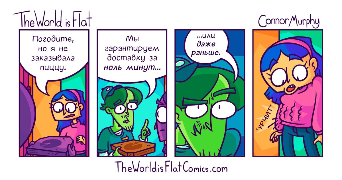 Художники веб-комиксов очень часто шутят о еде - оно и не удивительно, все-таки потребление пищи - это неотъемлемая часть жизни любого человека. Если говорить о конкретных блюдах, то шутки о них, конечно же, варьируются в зависимости от страны, в которой живет автор, но есть как минимум одно блюдо, о котором сейчас шутят практически везде. Речь, конечно же о пицце. Уже давно это мучное изделие с начинкой стало плотно ассоциироваться с доставкой еды на дом, посиделками с друзьями или просто вечерами, когда захотелось порадовать себя чем-то вкусным. И сегодня я как раз собрал для вас 10 отличных комиксов про пиццу. Надеюсь, что вам понравится! Американский художник Коннор Мерфи (Connor Murphy) работает режиссером и художником по раскадровке в известном проекте Cyanide & Happiness («Цианид и Счастье»), но есть у него и личная серия комиксов. Она называется The World is Flat («Мир - плоский») - это небольшие истории о самых разных персонажах. К примеру, главными героями комикса, который по