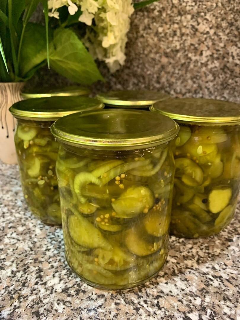 #заготовки #огурцы #июль Ингредиенты: огурцов, луковицы, соли , сахара, яблочного уксуса, куркумы, черного перца горошком, горчицы в зернах Способ приготовления: Огурцы хорошо вымыть и нарезать кружочками толщиной 0,5 см. Лук нарезать тонкими кольцами. Огурцы и лук поместить в кастрюлю или чашку и пересыпать солью, перемешать. Сверху положить гнёт и оставить на 3-4 часа. Затем овощи залить 1 литром воды и промыть. Дать воде стечь. Для маринада: в отдельную кастрюлю влить уксус, всыпать сахар, куркуму, семена горчицы, чёрный перец горошком. Помешивая, довести до кипения и растворения сахара. В маринад выложить овощи. Дать закипеть и сразу выключить огонь. 0,5 литровые банки простерилизовать. Разложить огурцы по банкам, сразу закатать и перевернуть вверх дном.