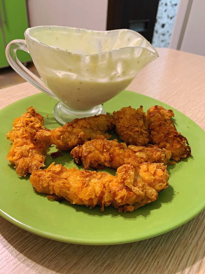 Ингредиенты: Куриная грудка, Паприка, Соль, Перец, Мука, Яйца, Чипсы любые для панировки, у меня Lays с беконом, Для соуса: , сметана, чеснок, майонез, укроп, малосольные огурчики по желанию Способ приготовления: Приготовив все ингредиенты, куриную грудку нарезать на небольшие кусочки и замариновать на 10 минут (паприка, соль, перец). Далее готовим панировку. Взбиваем яйца, просеиваем муку и молоточком или руками делаем крошку из чипсов. Далее сам процесс, кусочек куриного филе обваливаем в муке, затем в яйце и чипсах. И так со всеми кусочками куриного филе). Заблаговременно смазать противень оливковым или подсолнечным маслом и застелить пергаментом, далее выкладываем наши стрипсы и выпекаем в духовке при 180. Время приготовления 25 минут. На фото малая часть стрипсов, так как они были очень вкусными и я успела запечатлеть только это😂😍 Для соуса смешала самые простые ингредиенты: майонез, сметана, чеснок, укроп и малосольные огурчики, это безумие какое-то💔