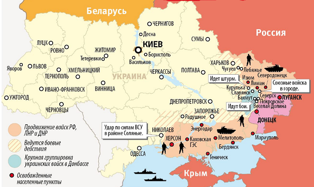 СВО длится пять месяцев. За этот период ВС Украины оказали серьезное сопротивление. Российские войска понесли серьезные потери в людях и военной технике. Через месяц после начала СВО они оставили первоначально захваченные территории Сумской, Черниговской, Киевской и частично Харьковской областей. Усилия российской армии были сосредоточены на наступлении в Донбассе.