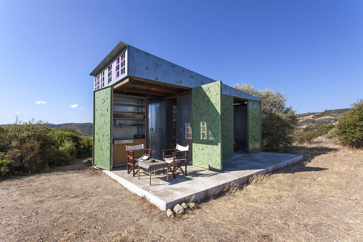 Этот миниатюрный домик для летнего отдыха построен в живописной оливковой роще с видом на море и Афонский монастырь вдали. Проект стал экспериментом в области цифрового CAD/CAM проектирования. Все детали были изготовлены заранее, но дизайн тщательно учитывал положение солнца, затенение и визуальные векторы. Внешняя оболочка выполнена из перфорированных металлических листов с текстильным узором оливковой тематики, что, совместно с возможностью сдвижки обеспечивает максимальную гибкость и создаёт постоянно меняющийся теневой узор. Название: Дом «Оливковое дерево» (Olive Tree House)