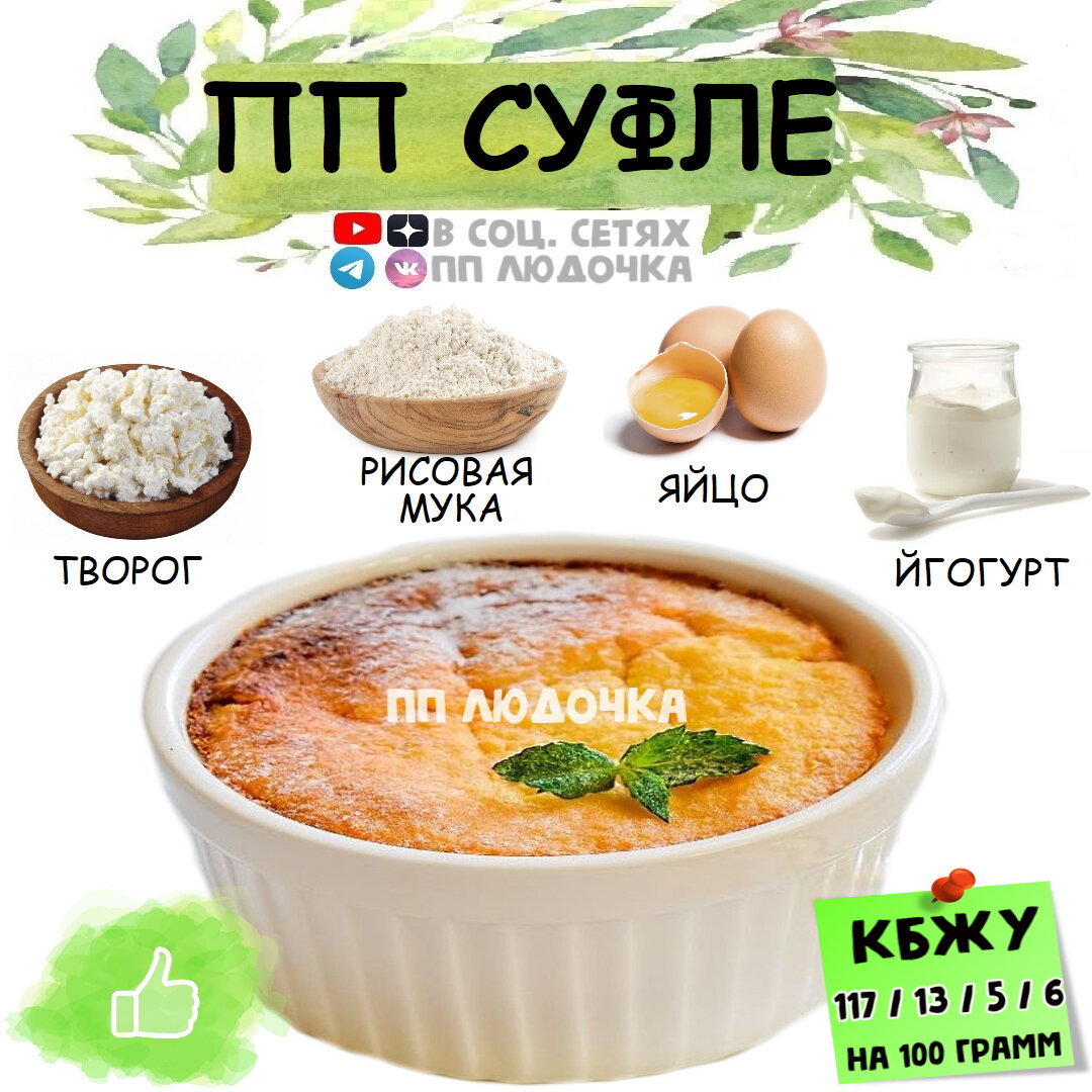 Не забываем подписаться, чтобы не пропустить ничего вкусного, стройнящего и здорового 💚 У данного суфле нежный вкус, с мягкими нотками ванили, однозначно придется по вкусу всем любителям творога! 🔥 📝 КБЖУ на 100 г. = 117 / 13 / 5 / 6 ⭐️ Сложность (1 из 5) ⏰ Время приготовления: 2 часа ✅ ИНГРЕДИЕНТЫ: 🍶 Творог 5% - 400 г. 🍶 Яйцо - 1 шт. 🍶 Мука рисовая - 30 г. 🍶 Ванилин - 1 г. 🍶 Натуральный йогурт Danone - 170 г. 🍶 Сахзам - по вкусу ✅ ПРИГОТОВЛЕНИЕ: В одной миске соедините яйцо с творогом. Добавляем все сыпучие ингредиенты к творогу. Добавляем 150 грамм натурального йогурта. Остальную часть оставим для смазывания суфле. Все тщательно перемешиваем до однородной консистенции, чтобы не было комочков. И разливаем по формочкам Разогреваем духовку до 200 градусов и запекаем наше суфле 25-30 минут. Затем даем остыть 1-2 часа и можно наслаждаться!