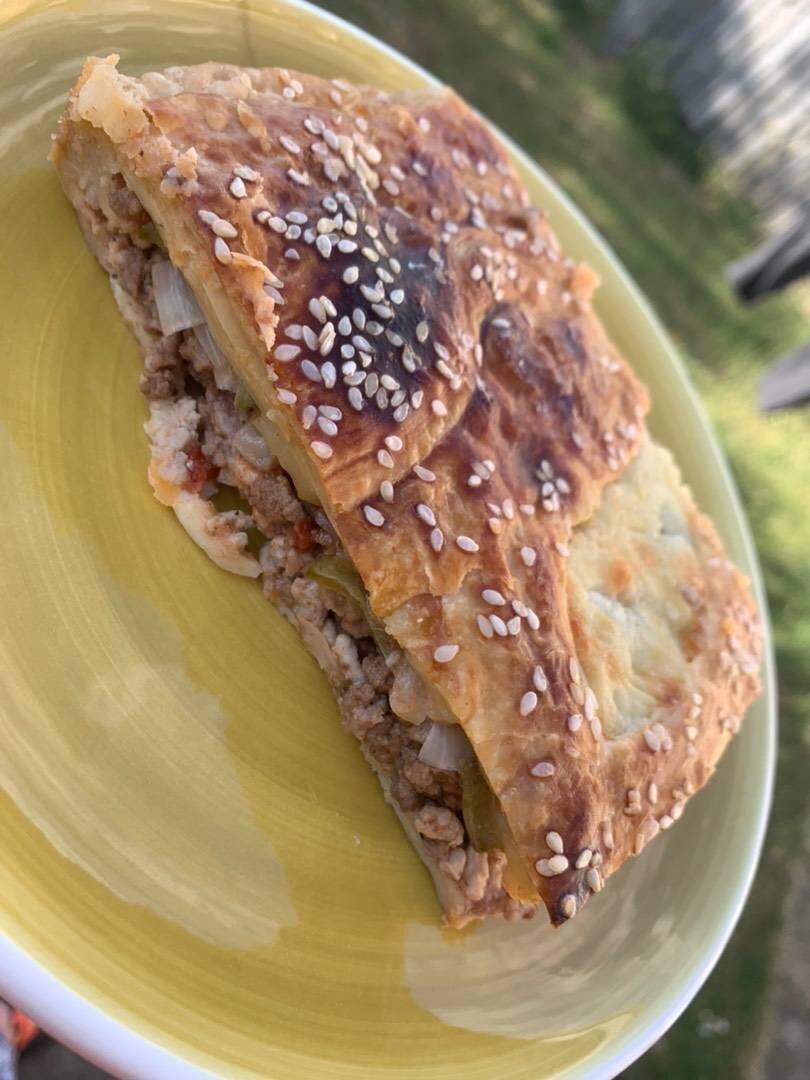 #среда Ингредиенты: теста, фарша, луковицы, томатного соуса, сыра, соленых огурца, Желток, кунжута, Соль, перец, Оливковое масло Способ приготовления: Фарш обжариваем на оливковом масле, солим, перчим. Тесто делим на 2 части.1-ю часть раскатываем и выкладываем на противень. Распределяем фарш на тесте. Обжариваем лук. Фарш смазываем томатным соусом и выкладываем лук. Нарезаем огурцы и натираем сыр. Распределяем равномерно в форме. Раскатываем 2-ю часть теста, накрываем пирог. Смазываем желтком и посыпаем кунжутом. Запекаем в духовке при 180 градусах до готовности.