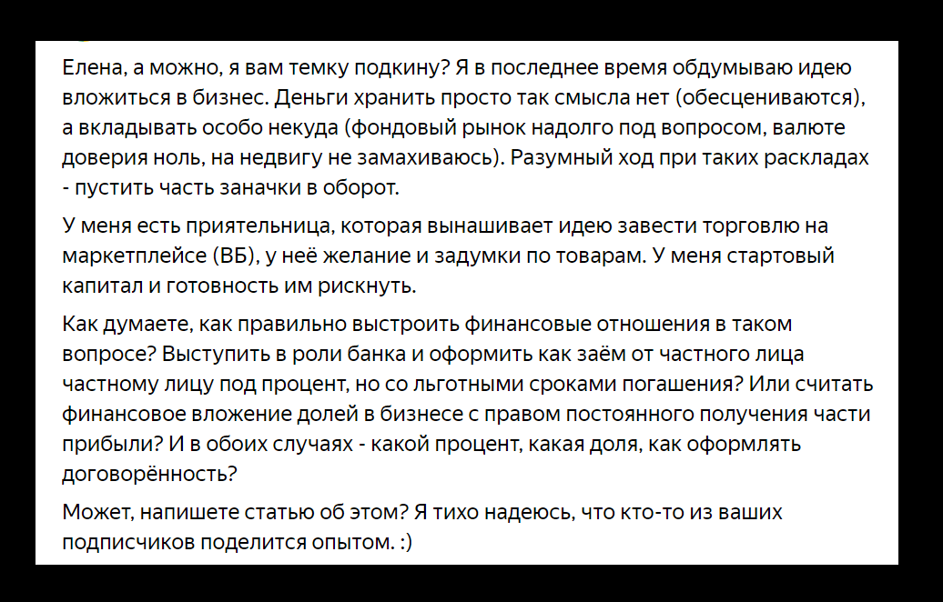 Представлю вашему вниманию пять ситуаций, когда у вас просят в долг. Рассматриваем со стороны выгоды, рисков и нравственной (стоит ли помочь или сам выкарабкается). 1. Друг недавно развелся. Разводились плохо, со скандалом, дележкой имущества. Двое детей. Внезапно ему приходит с налоговой письмо, что с квартиры, проданной при разводе, нужно оплатить налог. Просит 60000 на полгода, его зарплата 45000, отдавать планирует по 10000 в месяц. 2. Подруга просит 30000, чтобы продлить грейс на кредитке. Сразу отдать не сможет, так как с той кредитки нельзя ни снимать наличность, ни переводить. Предлагает отдавать с каждой зарплаты по 7000-8000 плюс в счет долга оплачивать вашу квартплату и любые покупки онлайн. 3. Третий пример - от читательницы. Прилагаю скрин: 4. Знакомый в мессенджере ВК просит 500 рублей до завтра. Он стоит на кассе в магазине, и у него не хватило денег. 5. Коллега просит 20000 до сентября. Сейчас июнь. Небольшая деталь: в августе у него отпуск. Зато есть плюс: вы знаете