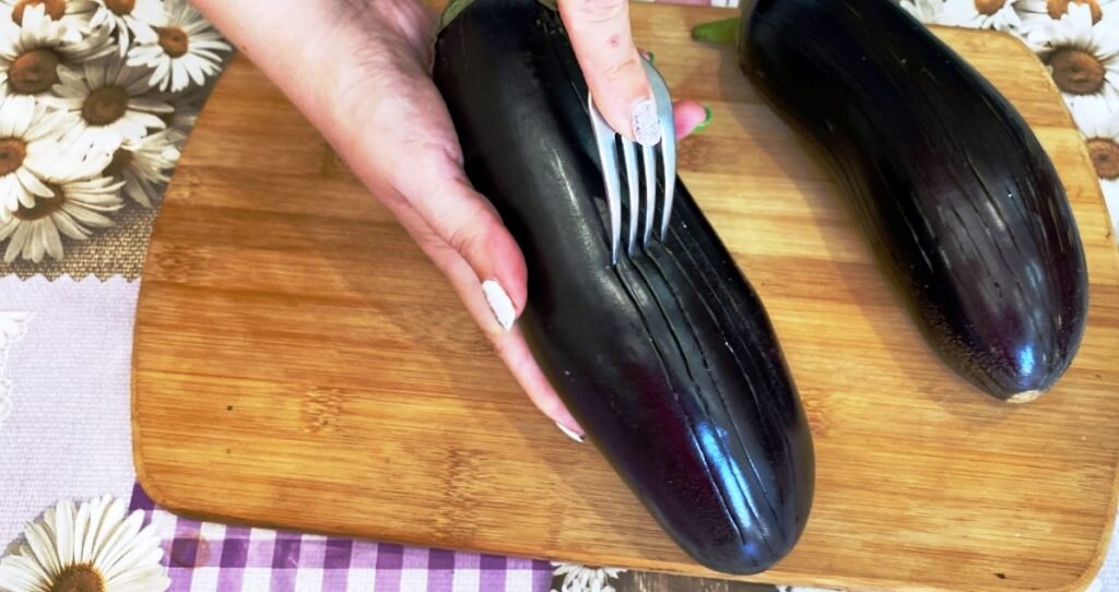 Вилкой царапаем вдоль баклажаны и режем брусочками.