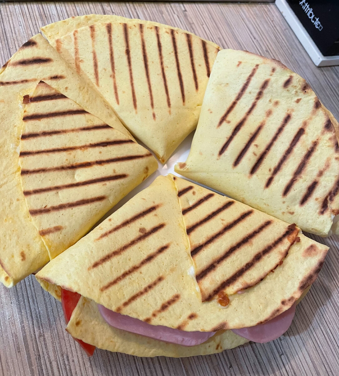 Друзья! Всем привет! Сегодня приготовим быстрый, вкусный, сытный завтрак или перекус! Лепёшка тортилья с начинкой - рецепт простого блюда, вкус которого будет зависеть только от вас и ваших предпочтений! В качестве начинки можно использовать абсолютно любые продукты! Для приготовления нам понадобятся следующие ингредиенты: Итак, приступим к приготовлению Шаг 1. Подготавливаем все необходимые ингредиенты. Тортилья вы можете взять уже готовые, а можете испечь дома самостоятельно. Я использовала покупные тортильи. Помидоры промываем под проточной водой, обсушиваем бумажными полотенцами и нарезаем тонкими полукольцами. Сыр тонко нарезаем Шаг 2. На ровную поверхность кладём тортилью На тортилье делаем надрез от середины к краю. Визуально делим тортилью на 4 части, смазываем одну часть плавленым сыром Шаг 3. На другую часть выкладываем нарезанные помидоры Шаг 4. Затем выкладываем сыр Шаг 5. И на оставшуюся часть выкладываем тонко нарезанную ветчину Шаг 6. Сворачиваем наши тортиль