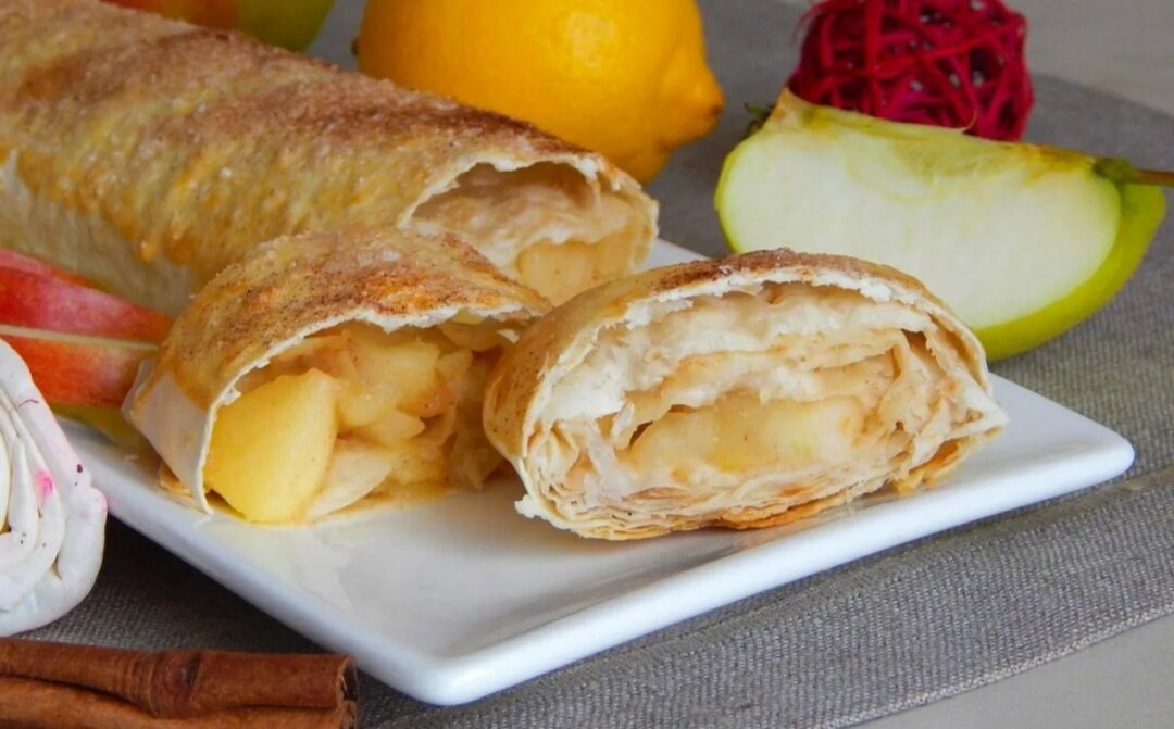 Ингредиенты: Бездрожжевой лаваш 100гр Яблоки очищенные 350 гр Корица 3 гр Подсластитель 10 гр (или сахар 40-50 гр) Яичный желток 1шт Приготовление: Нарежьте кубиками яблоки. Смешайте их с корицей и подсластителем . Обжарьте на сковороде в течение 5 минут. Выложите яблоки на лаваш (по желанию посыпьте кунжутом) и сверните в рулет. Выпекайте в разогретой до 180 °С духовке 15 минут Приятного аппетита :)