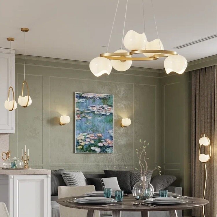 Световой сценарий – один из важных элементов интерьера. Тем более, когда речь идет о зале. Комфорт и красота в комнате, где мы проводим столько времени, выходят на первый план. Хотите подойти к процессу, как настоящий дизайнер? Рекомендуем начинать разработку светового сценария с точечных светильников. Это минимальное освещение для комфортного нахождения в комнате. Проще говоря, система точечных ламп. Когда вопрос с основным освещением решён, можно приступать к выбору красивой люстры в гостиную. В светодизайне она называется знаковой, потому что на неё делается акцент в интерьере. Все современные потолочные люстры для гостиной можно разделить на два типа в зависимости от их устройства. ✅ Те, что размещаются прямо под потолком. Отличаются компактными размерами, лаконичным дизайном – чаще у них один крупный плафон или несколько мелких. Потолочные приборы не дают много света, но, если комната небольшая, присмотритесь к ним. ✅ Подвесные. Самые популярные. Подвесные светильники крепят