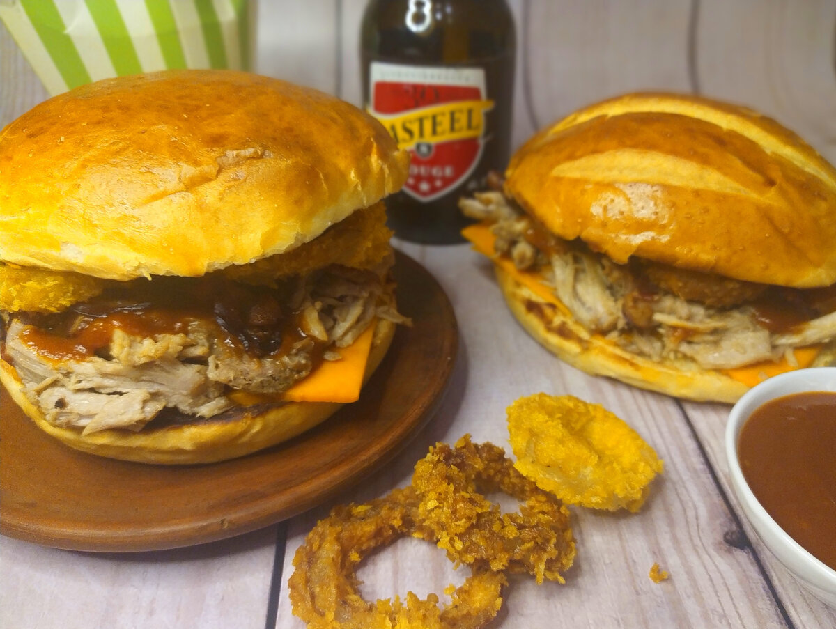 Сэндвич с рваной свининой в пиве, апельсиновым барбекю, жареным беконом, хрустящими луковыми кольцами и чеддером. 3 гавайские булочки