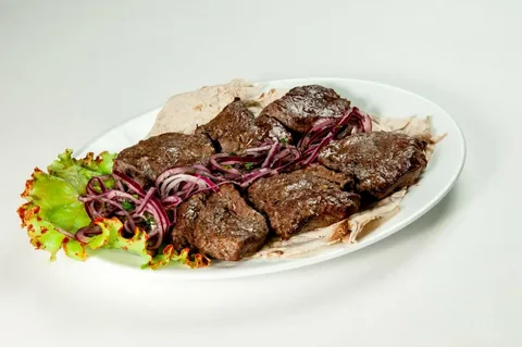 Ингредиенты Способ приготовления Зеленый лук вымыть, нарезать кусочками длиной 5–6 см. Репчатый лук очистить, вымыть, нарезать тонкими кольцами. Лимон вымыть и нарезать кружочками. Баклажаны вымыть, надрезать вдоль и, удалив семена, вложить в разрез тонко нарезанное курдючное сало, смешанное с вымытой и измельченной зеленью кинзы и петрушки, а также очищенным, вымытым и мелко нарезанным болгарским перцем,начинку поперчить и посолить. Подготовленные баклажаны перетянуть кулинарной нитью, аккуратно нанизать на вертел и жарить над раскаленными углями до готовности. Отдельно жарить над углями кольца репчатого лука и вымытые помидоры. Перед подачей к столу снять с баклажанов кулинарную нить, переложить их на блюдо, рядом положить кружочки лимона, зеленый лук, жареные лук и помидоры.