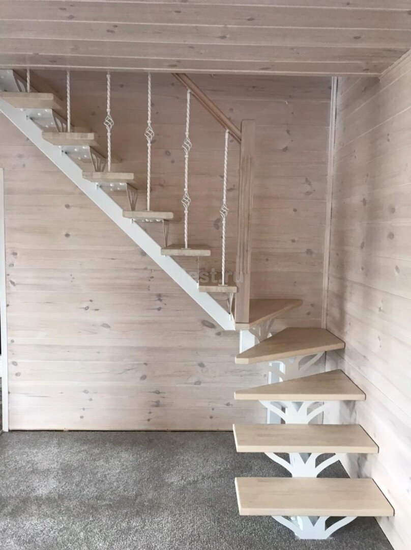 Являясь производителями лестниц, мы часто сталкиваемся с проблемой, что места под лестницу в доме совсем мало и проем второго этажа достаточно узкий для установки основательной конструкции. Грамотные инженеры и конструкторы справляются с этой сложной задачей. В статье мы решили показать примеры уже выполненных проектов. Лестница Г-образная на монокосоуре Mono Style Лаверн Г-образная лестница на надежном металлическом каркасе идеально вписалась в маленькое помещение и узкий проем. На фото видно, что места под лестницу было совсем мало. Тем не менее удалось поставить лестницу на основательном металлическом каркасе из профильной трубу 100х100 мм. Ступени лестницы из натурального массива сосны. Ширина ступеней составила 800 мм, что является вполне адекватных для качественного передвижения между этажами. Лестница Г-образная на монокосоуре Mono Style Грейс Еще один пример проекта лестницы, которая не смотря на мощную и основательную конструкцию занимает минимум места в доме. Крепкий металл