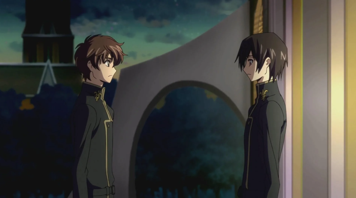 Дружеские взаимоотношения героев формируются ещё в детстве и становятся настолько крепкими, что даже промежуток в 6 лет, за который они не виделись, не становится проблемой для их связи. Сложная мировая ситуация побудила обоих начать действовать, для создания лучшего мира: Сузаки стал военным Империи и намеревается изменить её изнутри, а Лелуш обрёл могущественную силу гиас, используя которую со своими неординарными способностями планирует силовым методом свергнуть нынешнего правителя. На пути к цели ирония жизнь сталкивает их друг с другом, хотя сначала ни кто из них не знает, что напротив стоит лучший друг. Однако Лелуш всё же узнаёт о том, что сталкиваться ему зачастую приходится с Сузаки, при этом протагонист остаётся инкогнито.