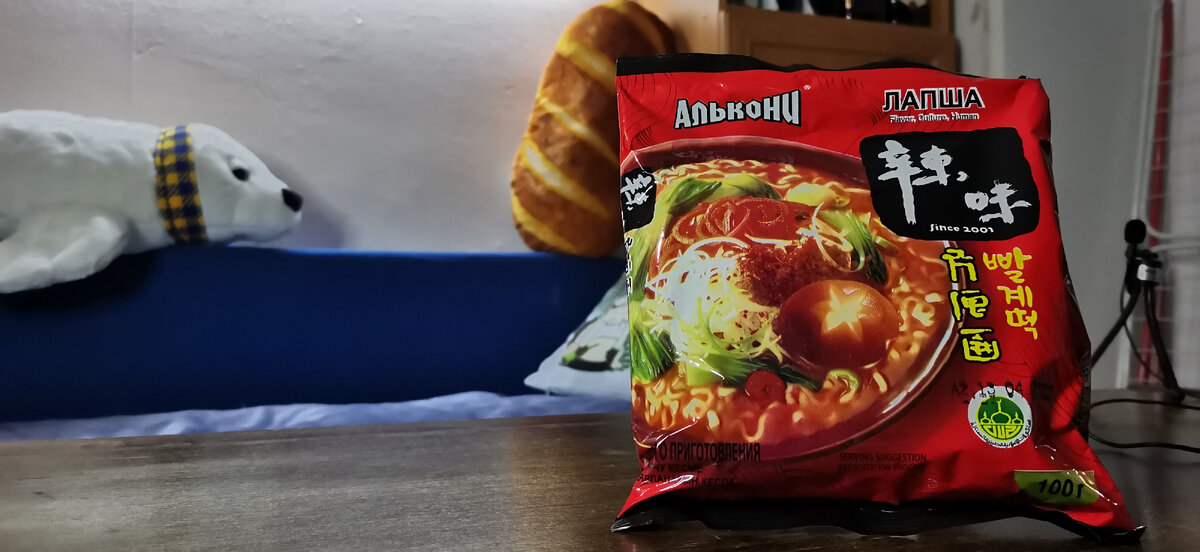Наткнулся пару месяцев назад мой друг на вот такую лапшу в магазине "верный", недолго думая, решил привезти её мне пару дней назад. Итак, представитель под брендом "Алькони" со вкусом "острая говядина" прилетел к нам из Киргизской Республики, а просили за него 70 рублей. Сама упаковка донельзя "информативна". Она сообщает нам, по сути, только бренд и род самого продукта. О заявленном вкусе мы узнаём уже со стикера на русском языке, что на обратной стороне упаковки. Внутри нас приветствует один из стандартных наборов в виде суповой основы, сушёной зеленушки и пасты(ну или соуса, если угодно). Сама лапша средней толщины. Даже в сухом виде она обладает ярко выраженным запахом пшеничной лапши. Суповая основа не отличается ярким цветом, чего не скажешь о пасте. Так же в пакетике с сушёной зеленушкой присутствуют соевые катушки (имитация мяса, а-ля доширак). Касаемо инструкции, она здесь донельзя простая. Засыпать, залить 400мл кипятка, накрыть и подождать. Производитель поместил все эти де