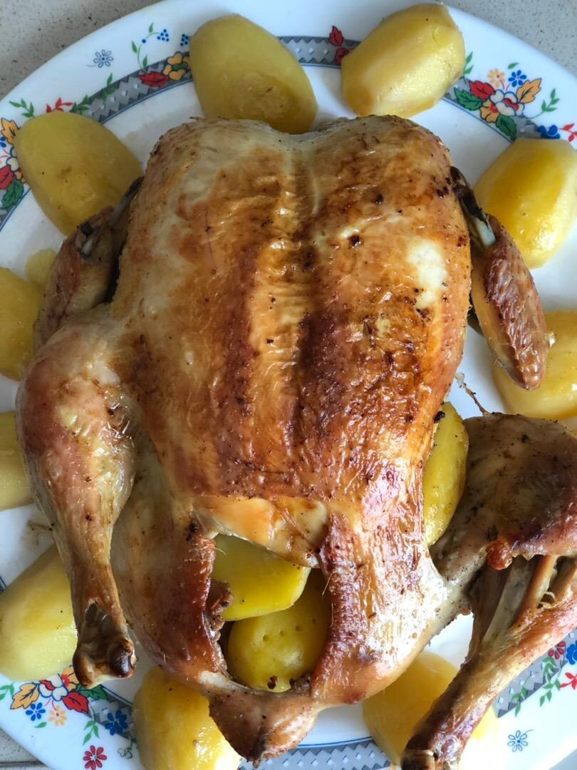 Приготовила по просьбе близких людей… #ужин Понадобится Рукав для запекания XL Ингредиенты: курица 2,2 кг, картофель, соль, лимон, Смесь перцев, лавровый лист, перец чёрный горошком, сливочного масла Способ приготовления: Курицу очистить от оставшихся стержней до гладкости кожи и внутри. Овощи очистить, вымыть. Приготовить смесь для обмазки курицы: из половины лимона выжать сок в чашку. Туда же добавить и перемешать молотую смесь перцев. Обмазать тушку курицы этой с местью внутри и снаружи. Рукав для запекания положить на противень. В нем из картофеля сделать ‘ подушку’ для курицы. На него положить куриную тушку. Во внутрь курицы положить 1/2 лимона и несколько штук картофелей перец чёрный горошком и лавровый лист.. В рукаве сделать ‘подушку ‘ из картофеля. На него положить тушку курицы. Сверху на неё положить кусочек сливочного масла. Концы рукава завязать с обоих концов. Противень поставить в духовку при 190 гр. на 2 часа. За 10 минут до окончания рукав разрезать для получения румяно