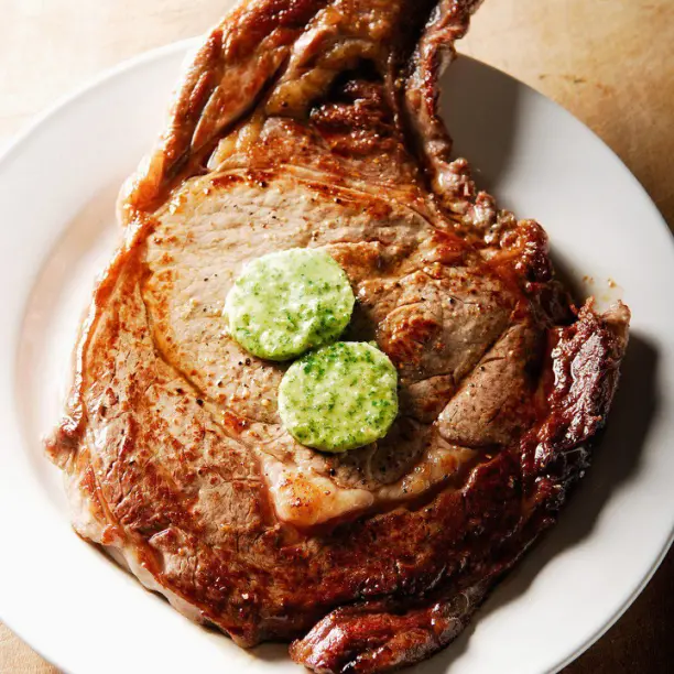 Бифштекс на гриле под соусом Метрдотель ИНГРЕДИЕНТЫ: говяжье мясо (нарезать ломтиками по 2 см толщиной) растительное масло Для соуса Метрдотель: 12 г сливочного масла на одну порцию сок 1 лимона перец, соль зелень петрушки ПРИГОТОВЛЕНИЕ: Ломтики мяса смазать растительным маслом. Нагреть гриль, положить бифштексы и жарить по 5 минут с каждой стороны. Посолить Приготовить соус. Перемешать сливочное масло с мелко нарезанной зеленью петрушки, перцем, солью, лимонным соком и выложить на горячее блюдо. Подавать бифштекс с соусом.
