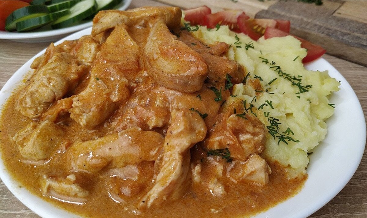 Бефстроганов из курицы - очень нежный и вкусный. И быстро готовится. Готовится так же, как и бефстроганов из говядины, но меньше по времени. Продукты на 4 порции Куриное филе – 600 г;Сметана – 2 ст. ложки;Томатная паста – 1 ст. ложка;Лук репчатый – 2 шт.;Мука – 0,5 стакана;Масло растительное – 2 ст. ложки;Бульон (воспользовалась разведенным в воде бульонным кубиком) – 1,5 стакана;Соль - по вкусу;Перец черный молотый - по вкусу Как приготовить беф-строганов из курицы: Вымытое и обсушенное куриное филе режем на куски толщиной 1 см .Слегка отбиваем эти куски и нарезаем из них полоски. Готовим соус. Для этого смешиваем в сотейнике сметану, томатную пасту и бульон. Солим и перчим по вкусу, доводим до кипения. Отставляем соус в сторону. Куриное мясо панируем в муке, но потом его помещаем в дуршлаг, чтобы стряхнуть лишнюю муку. Лук нарезаем и слегка пассеруем на сковороде с разогретым маслом. Выкладываем на лук курицу. Огонь - сильный. Мясо с луком все время мешаем, жарим 5-6 минут. Потом пом
