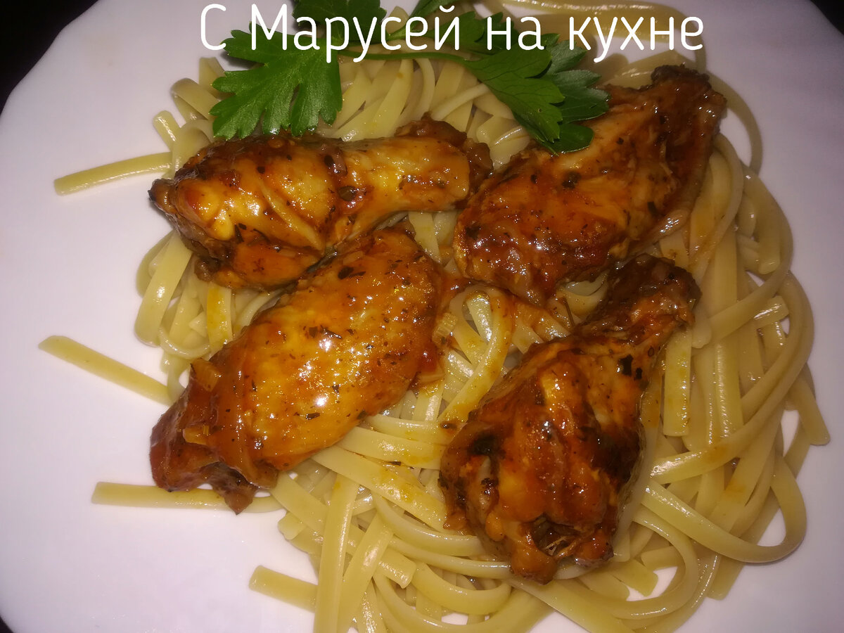 Крылышки куриные в томатном соке, тушенные на сковороде.