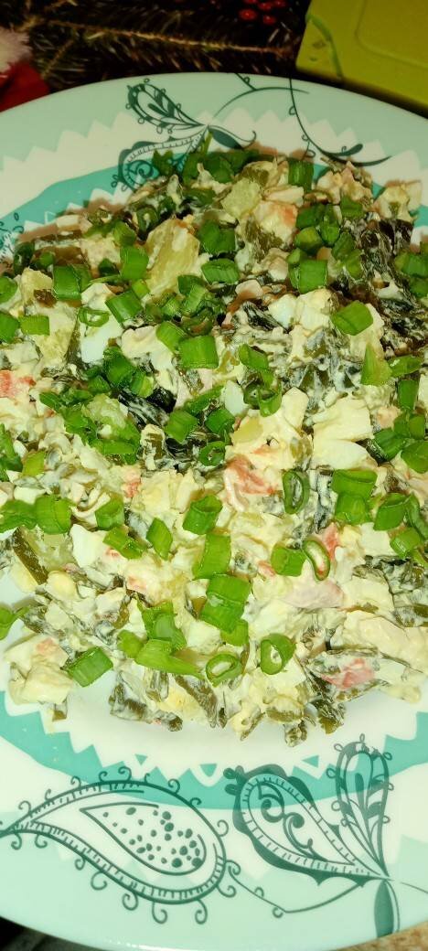 #июль #вкусно Отличный сытный и питательный салат. Ингредиенты: яйца куриные, воды, крабовое мясо или палочки, картофель, морская капуста(маринованная или консервированная), соль, майонез, зеленый лук Способ приготовления: Крабовое мясо или палочки мелко порезать кубиком. Морскую капусту откинуть на дуршлаг, и немного отжать. Отварить яйца в воде в крутую 10 мин. Остудить. Мелко порезать кубиком. Картофель помыть, отварить в воде до готовности 20 мин. в мундире. Остудить. Порезать кубиком. Смешать все ингредиенты, посолить, заправить майонезом. Лук помыть, мелко порезать. Украсить зелёным. Приятного аппетита 🌹